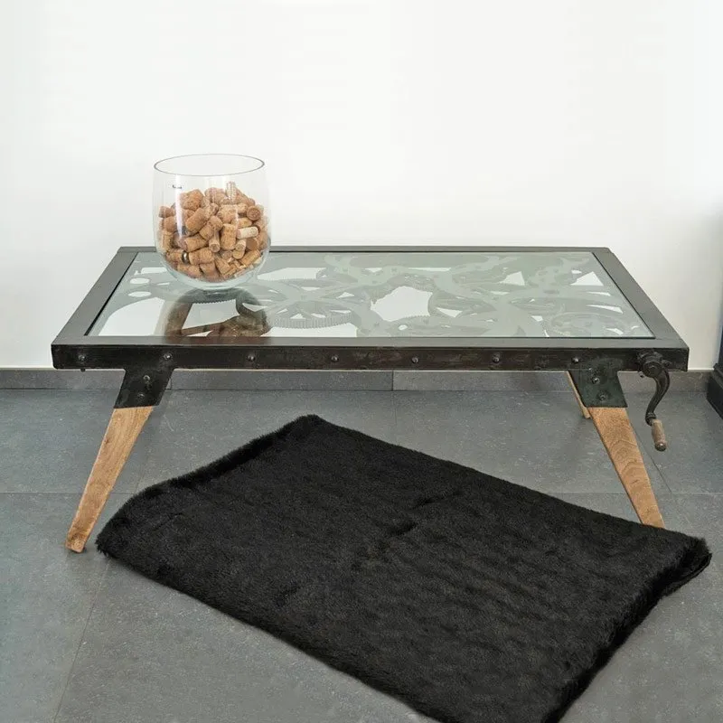 Een echt meesterstuk! In een vintage retro-chic stijl geeft deze salontafel met tandwielen de juiste toon aan! Van pure Industriële inspiratie vergrendelen de tandwielen zich met elkaar en kunnen zo geactiveerd worden door aan de zwendel aan de zijkant van de tafel te draaien. De solide metalen structuur, die het karakter en robuustheid vormt, wordt verlicht door zijn solide houten basis en zijn glazen blad. De combinatie van hout, metaal en de roterende tandwielen is een herinnering aan de stijl van industriële meubels. Het ligt niettemin voor de hand dat deze salontafel perfect gecombineerd kan worden met de chesterfield sofa’s of pilootfauteuils aviators om zo een prachtige vintage retro-chique stijl te bekomen. Met een carbonafwerking trouw aan de antieke stijl, zal deze salontafel de originele kant van je interieur inrichting versterken.
