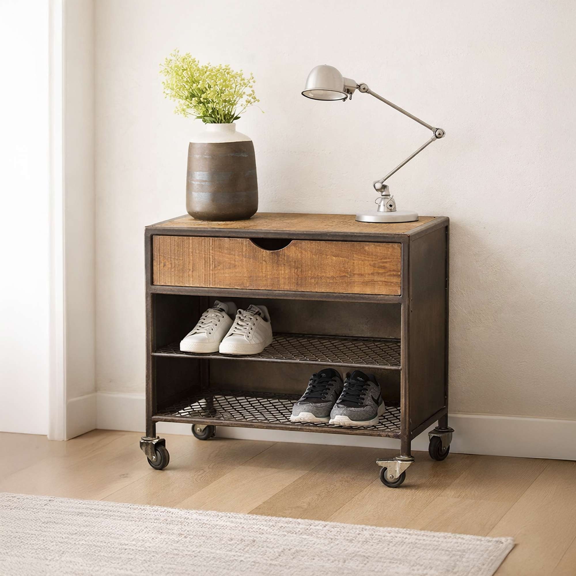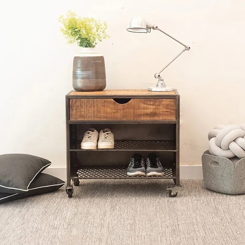 Haar natuurlijk getinte mangohouten bovenblad contrasteert perfect met het metaal van de rest van het meubel. Deze lage kast (65 cm hoog) bestaat uit drie niveaus. Onderaan zijn de eerste twee ruimtes open aan de voorkant van de kast en de bodem is samengesteld uit een metalen rooster in de vorm van kleine ruiten. De bodem blijft zo open. Aan de bovenkant van de kast is een lade van hetzelfde hout als het bovenbladde. Je kan er voor kiezen om er schoenen in te bewaren of je assortiment schoensmeer en andere verzorgingsproducten. Aan jou de keuze!