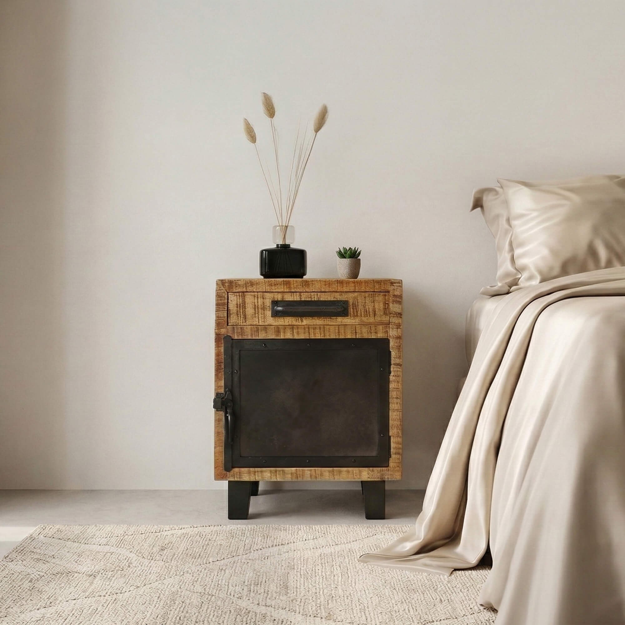 Het nachttafeltje Brooklyn combineert hout en zwart metaal tot een prachtig meubelstuk met een industrieel design dat uw slaapkamer veel karakter zal geven.