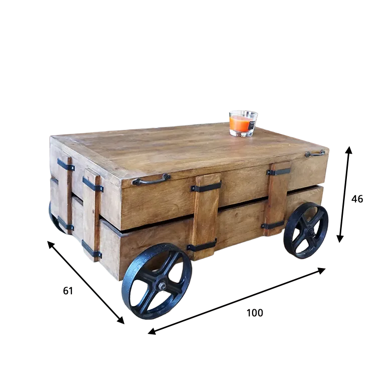 Salontafel in massief hout met metalen wieltjes en opbergkist