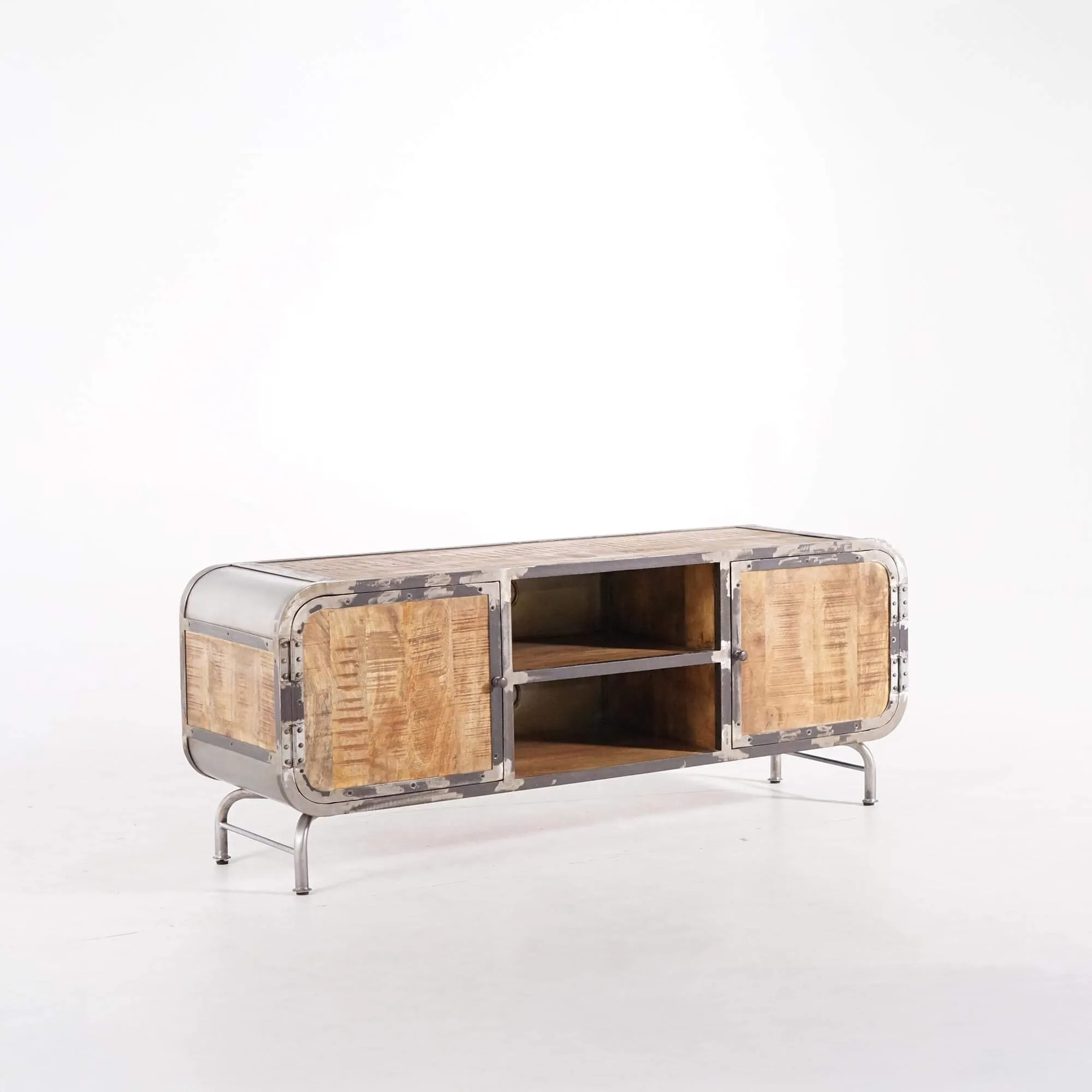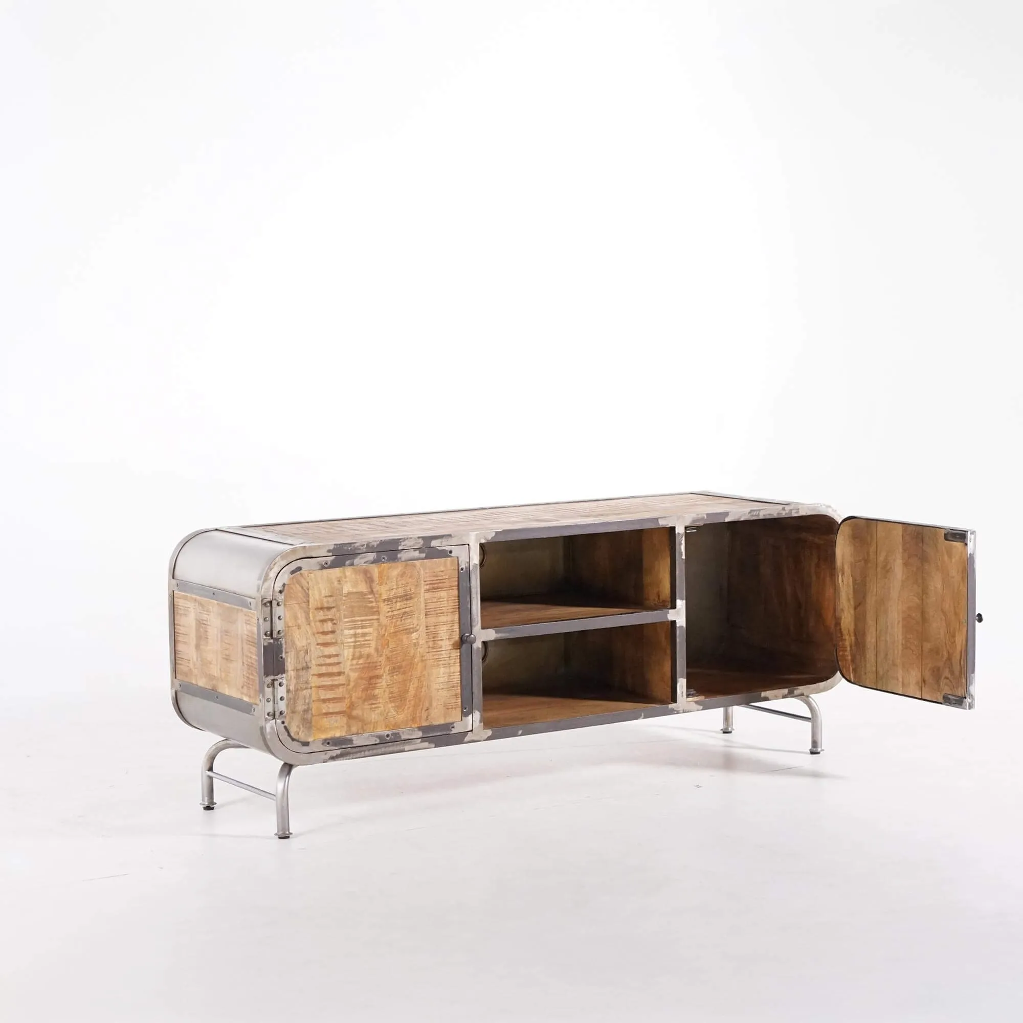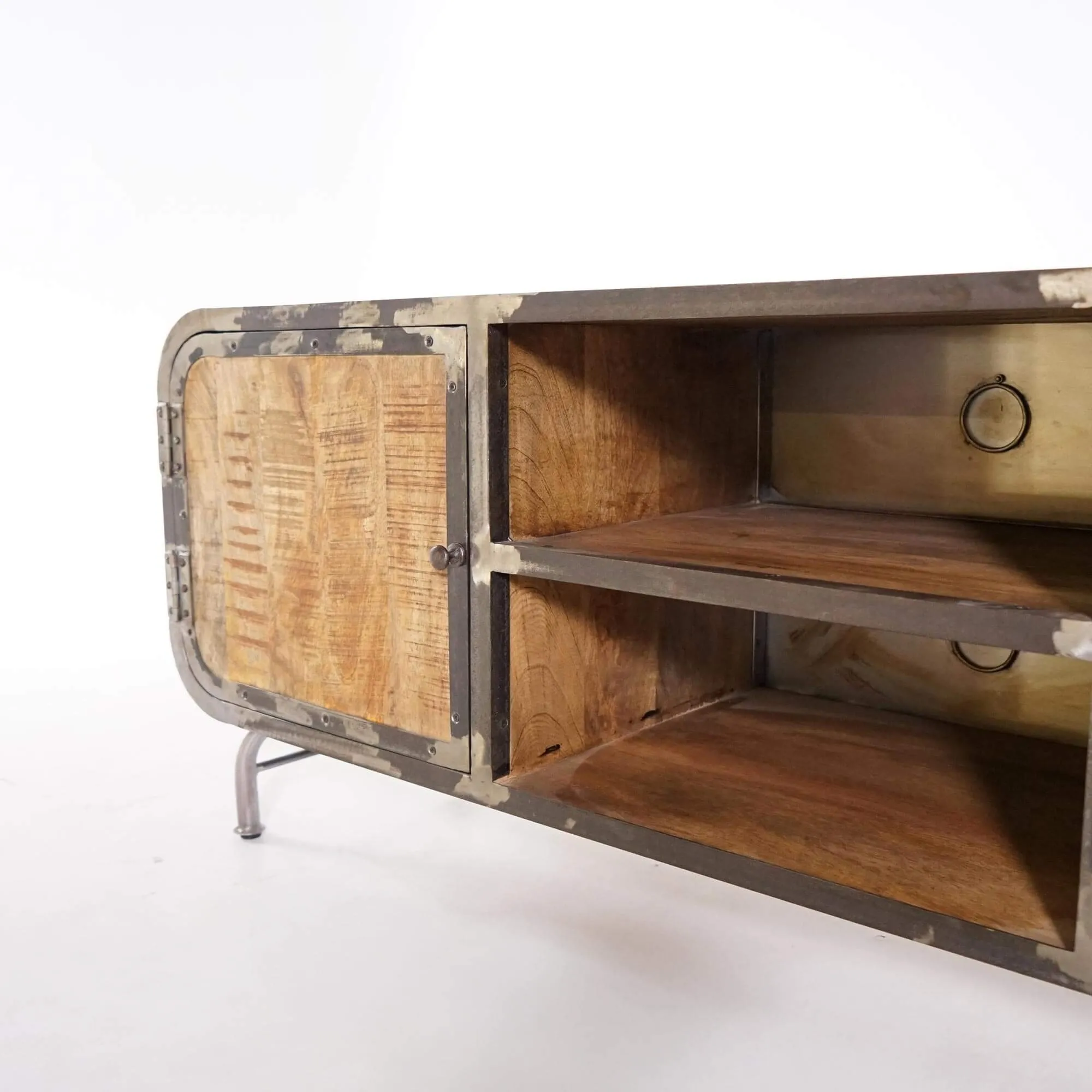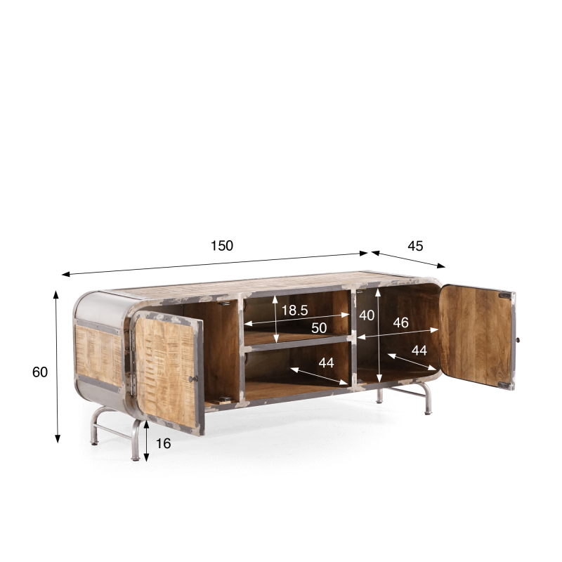 Elk element van dit TV-meubel is zorgvuldig ontworpen om de essentie van industriële stijl te weerspiegelen. De mangohouten panelen hebben een rijke nerf en natuurlijke kleur, wat een vleugje comfort toevoegt. Het grijze metaal, opzettelijk vervormd om een verroest effect op te roepen, geeft een onmiskenbare authenticiteit aan het geheel.