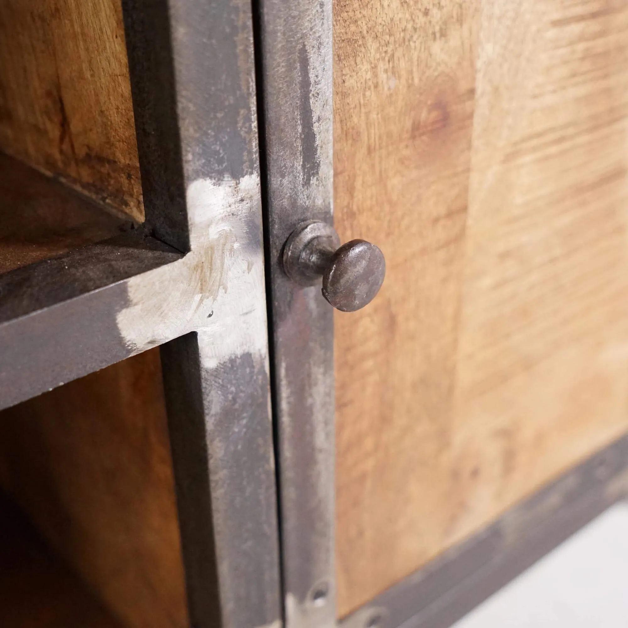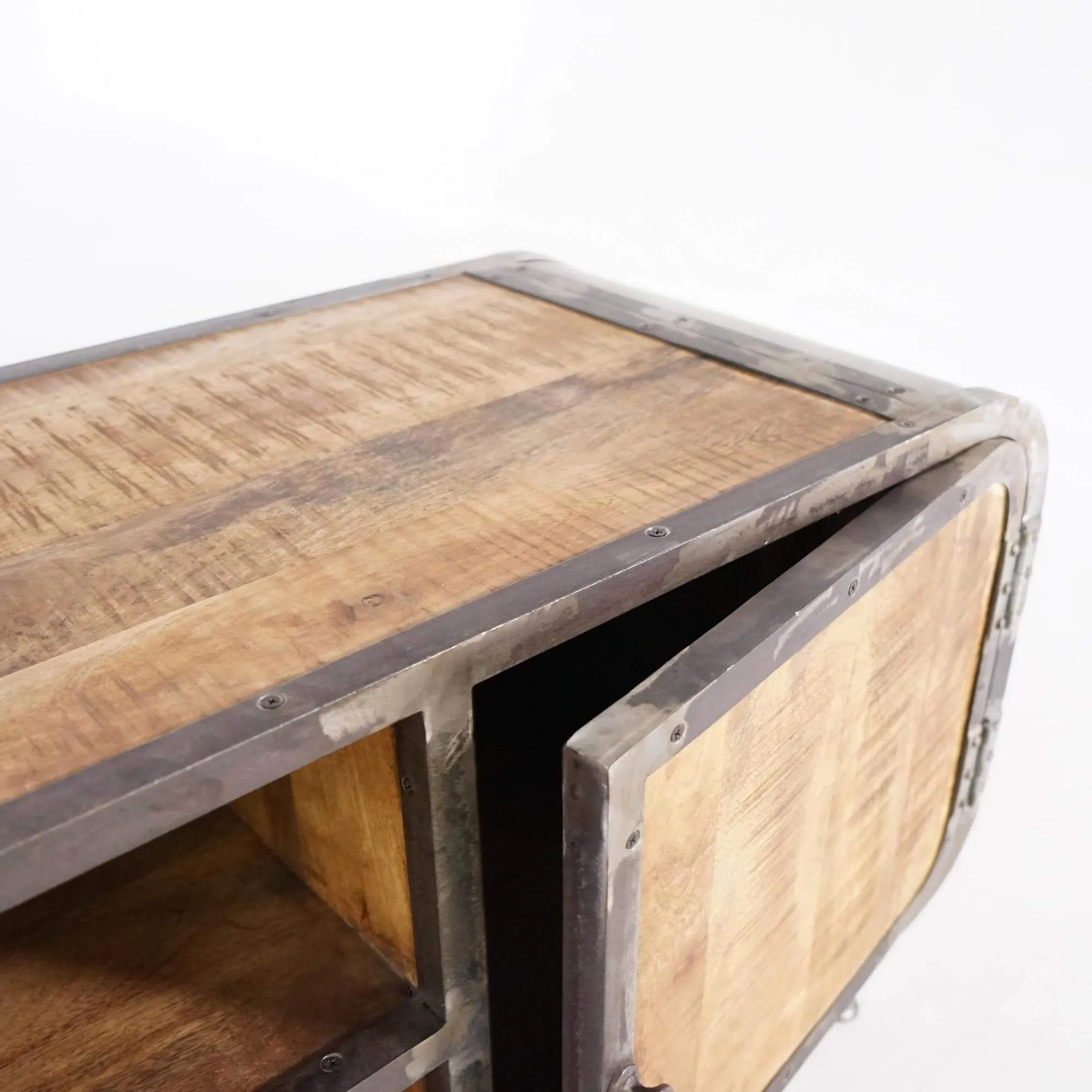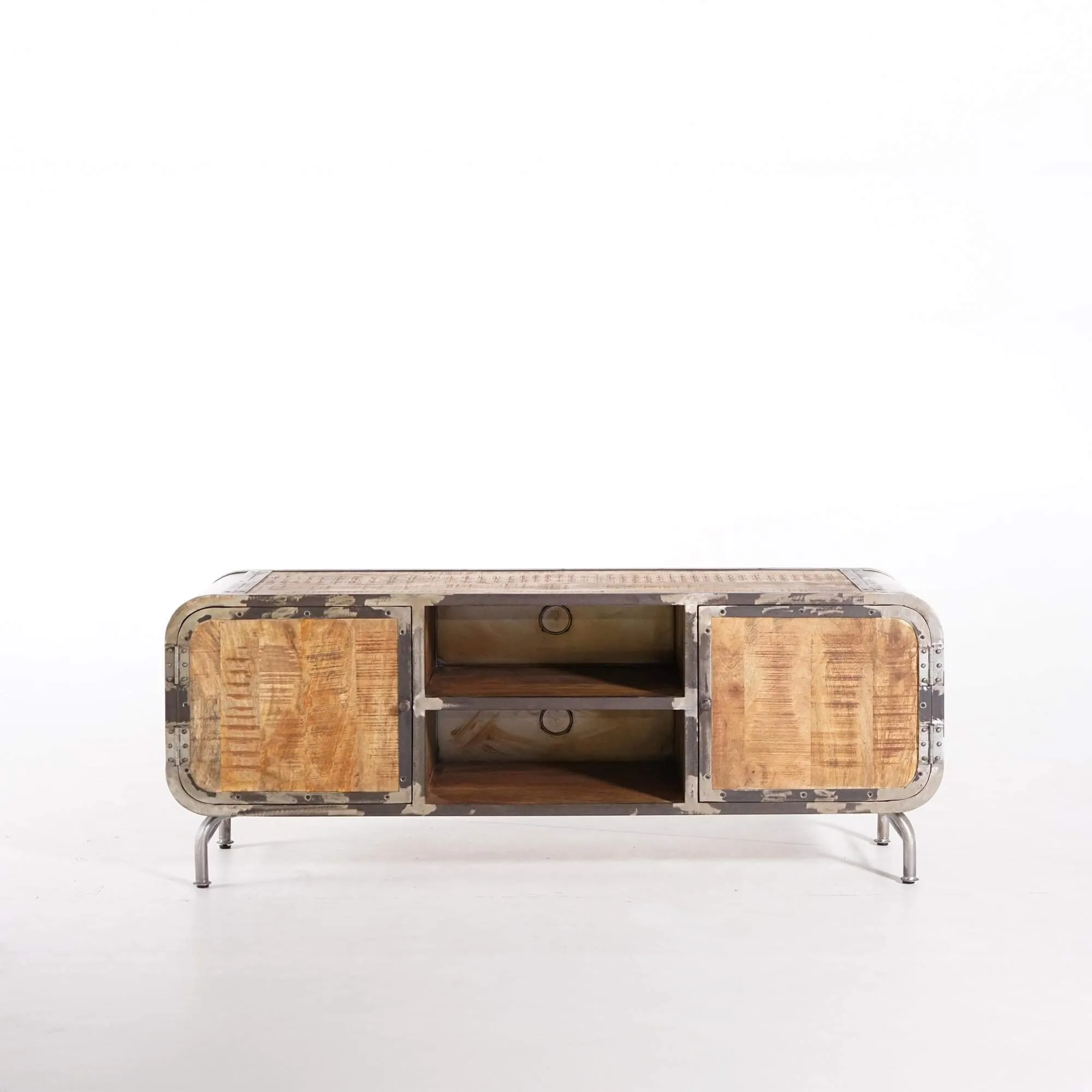 Elk element van dit TV-meubel is zorgvuldig ontworpen om de essentie van industriële stijl te weerspiegelen. De mangohouten panelen hebben een rijke nerf en natuurlijke kleur, wat een vleugje comfort toevoegt. Het grijze metaal, opzettelijk vervormd om een verroest effect op te roepen, geeft een onmiskenbare authenticiteit aan het geheel.