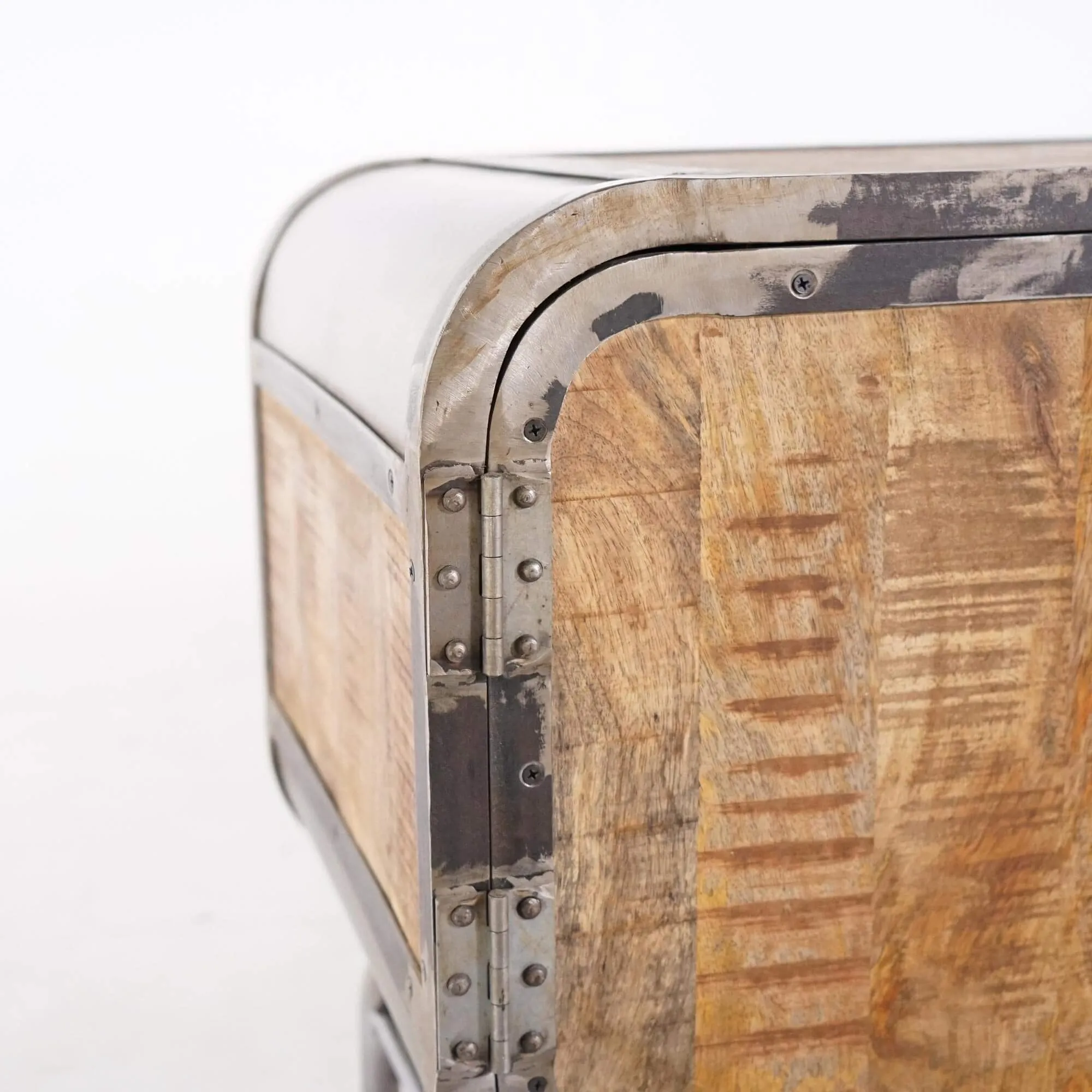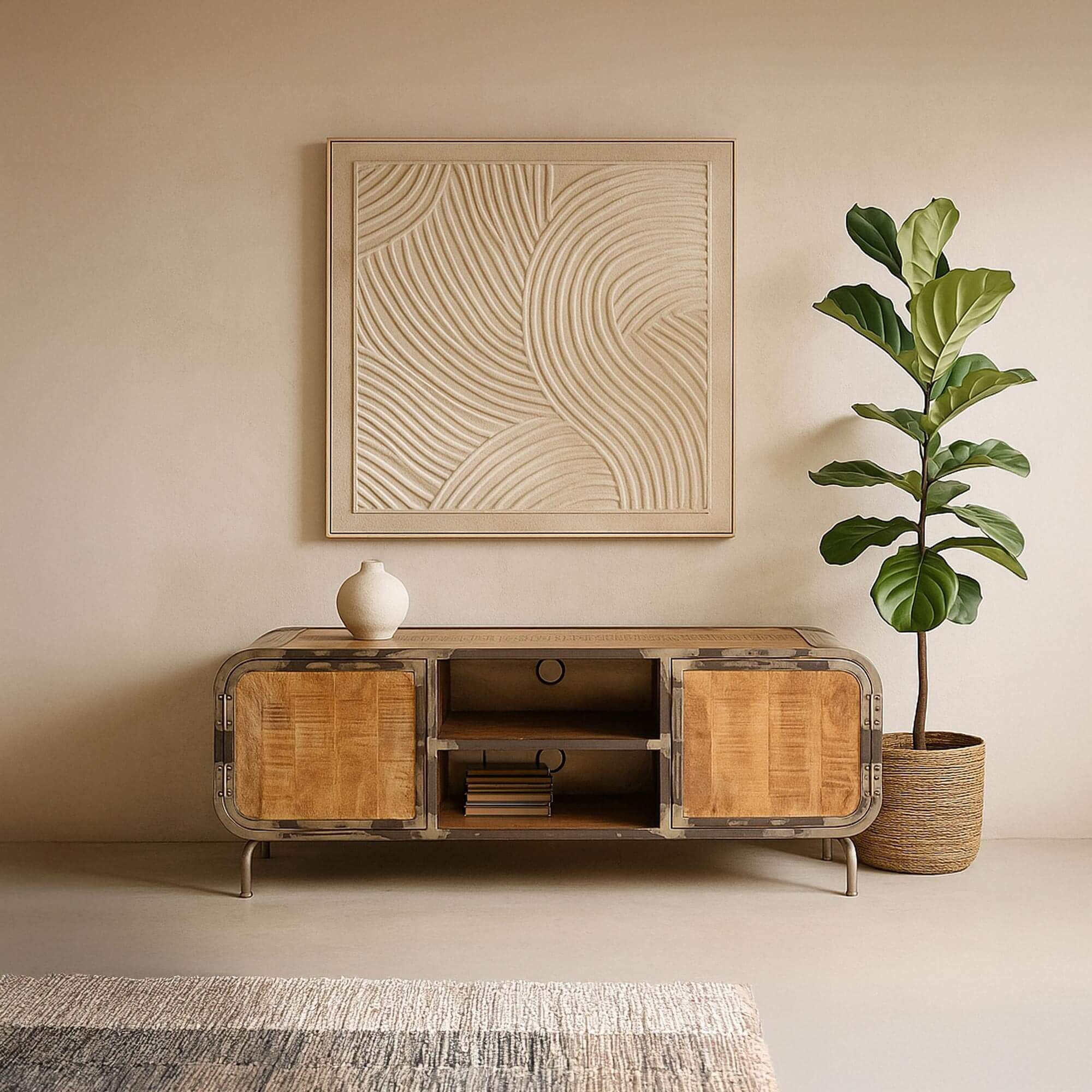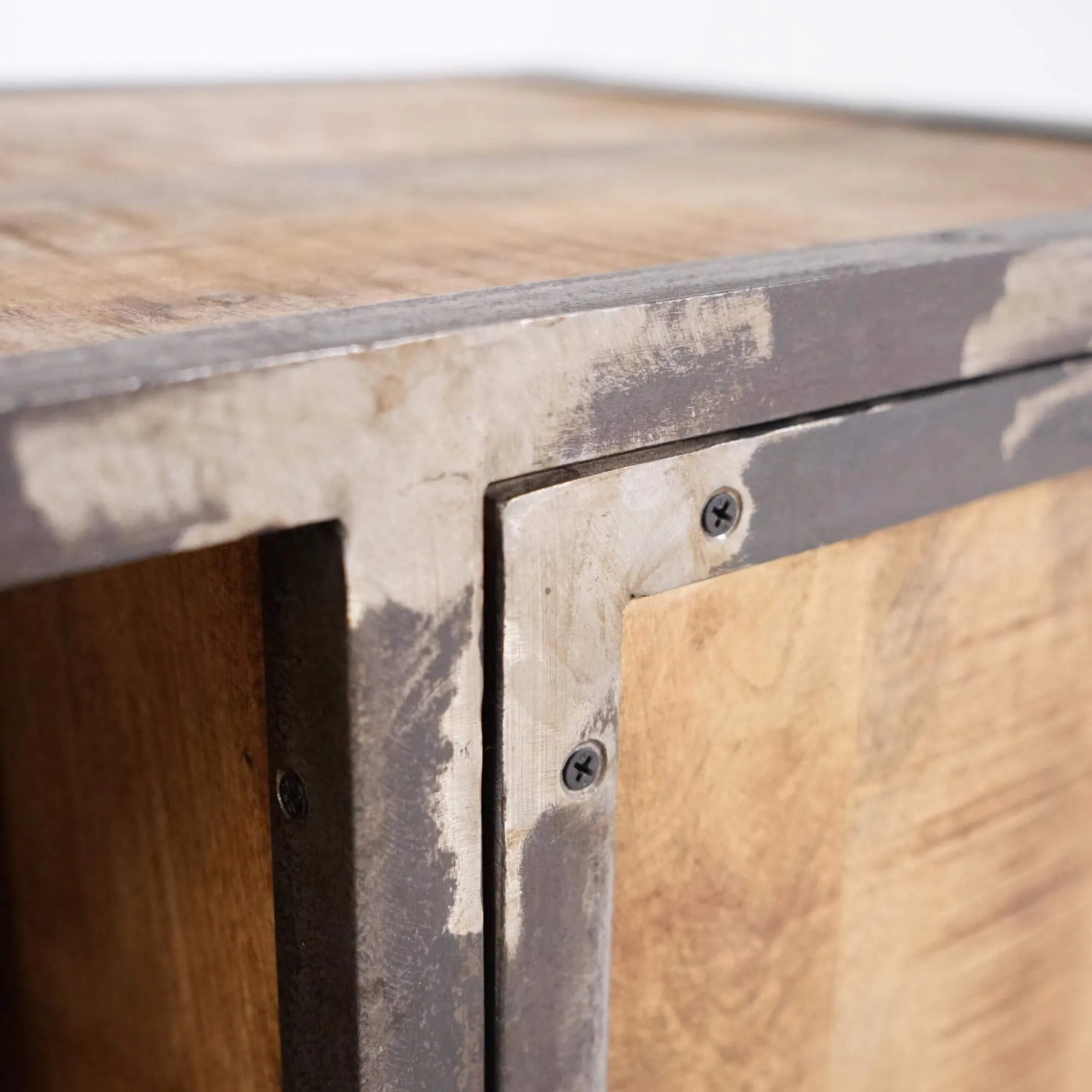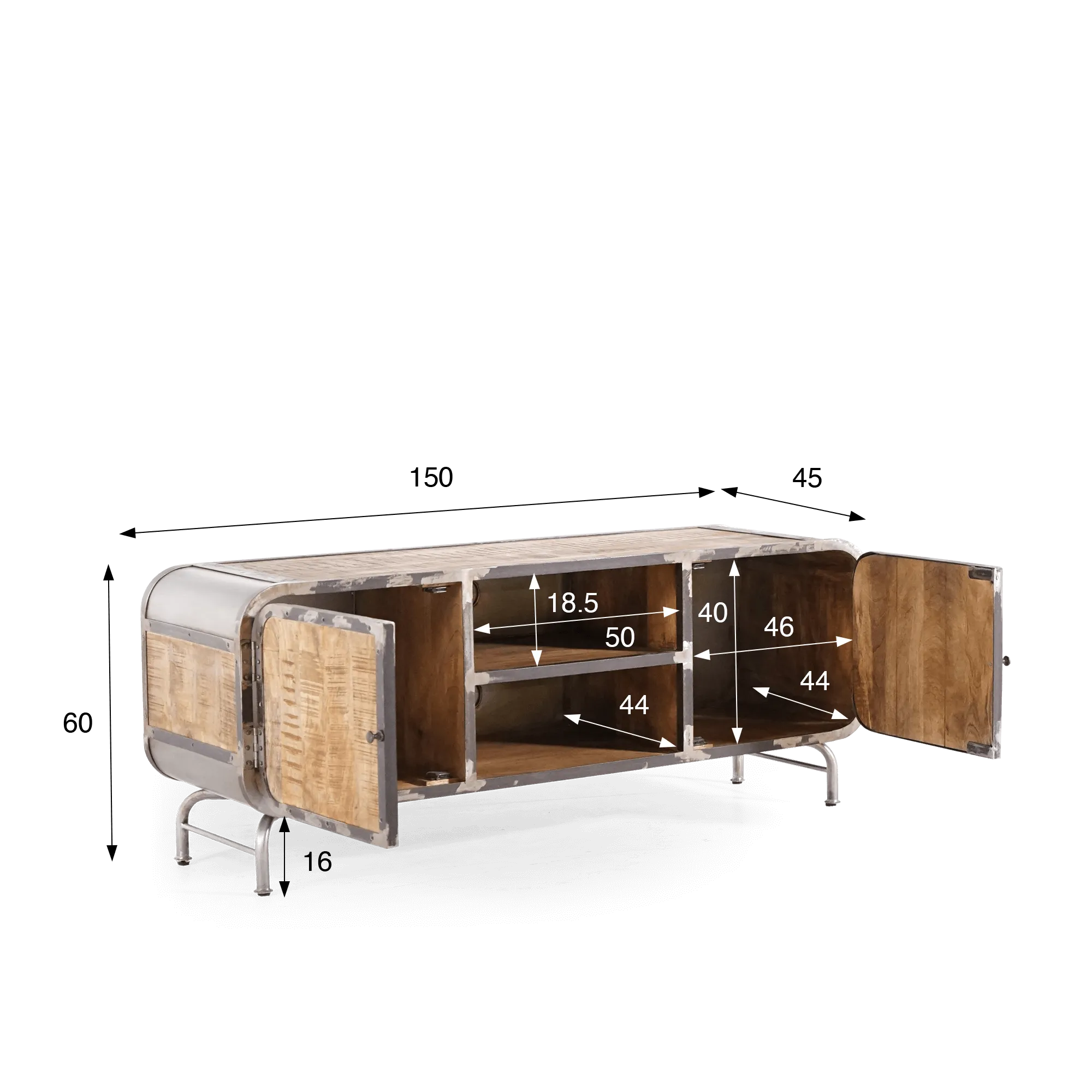 Elk element van dit TV-meubel is zorgvuldig ontworpen om de essentie van industriële stijl te weerspiegelen. De mangohouten panelen hebben een rijke nerf en natuurlijke kleur, wat een vleugje comfort toevoegt. Het grijze metaal, opzettelijk vervormd om een verroest effect op te roepen, geeft een onmiskenbare authenticiteit aan het geheel.