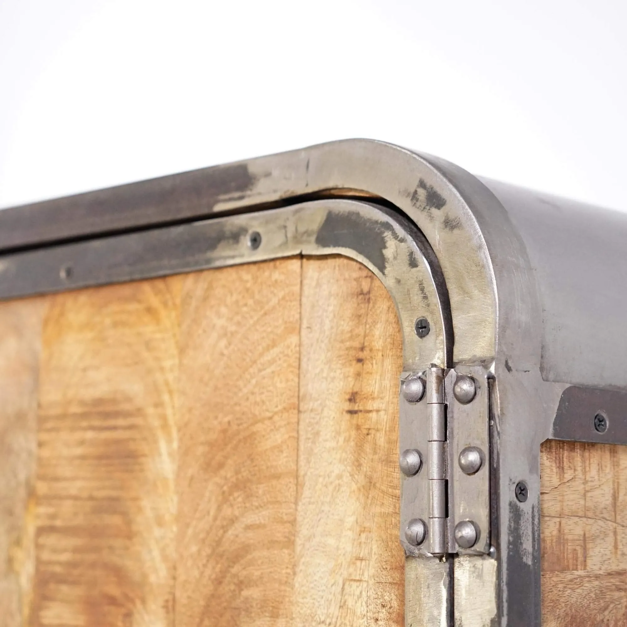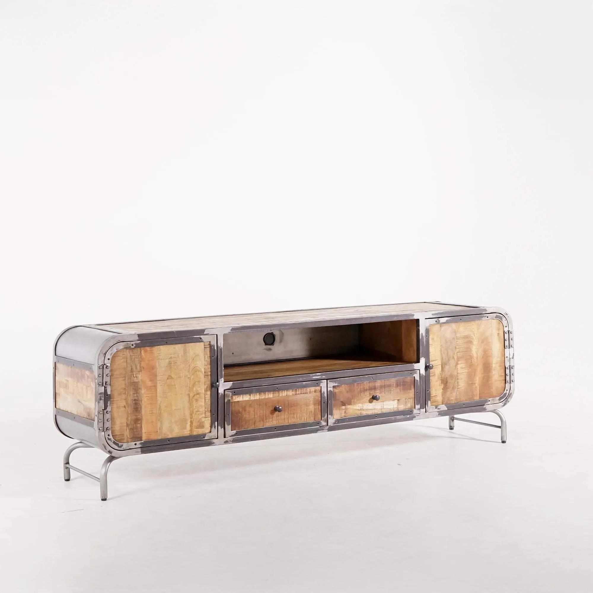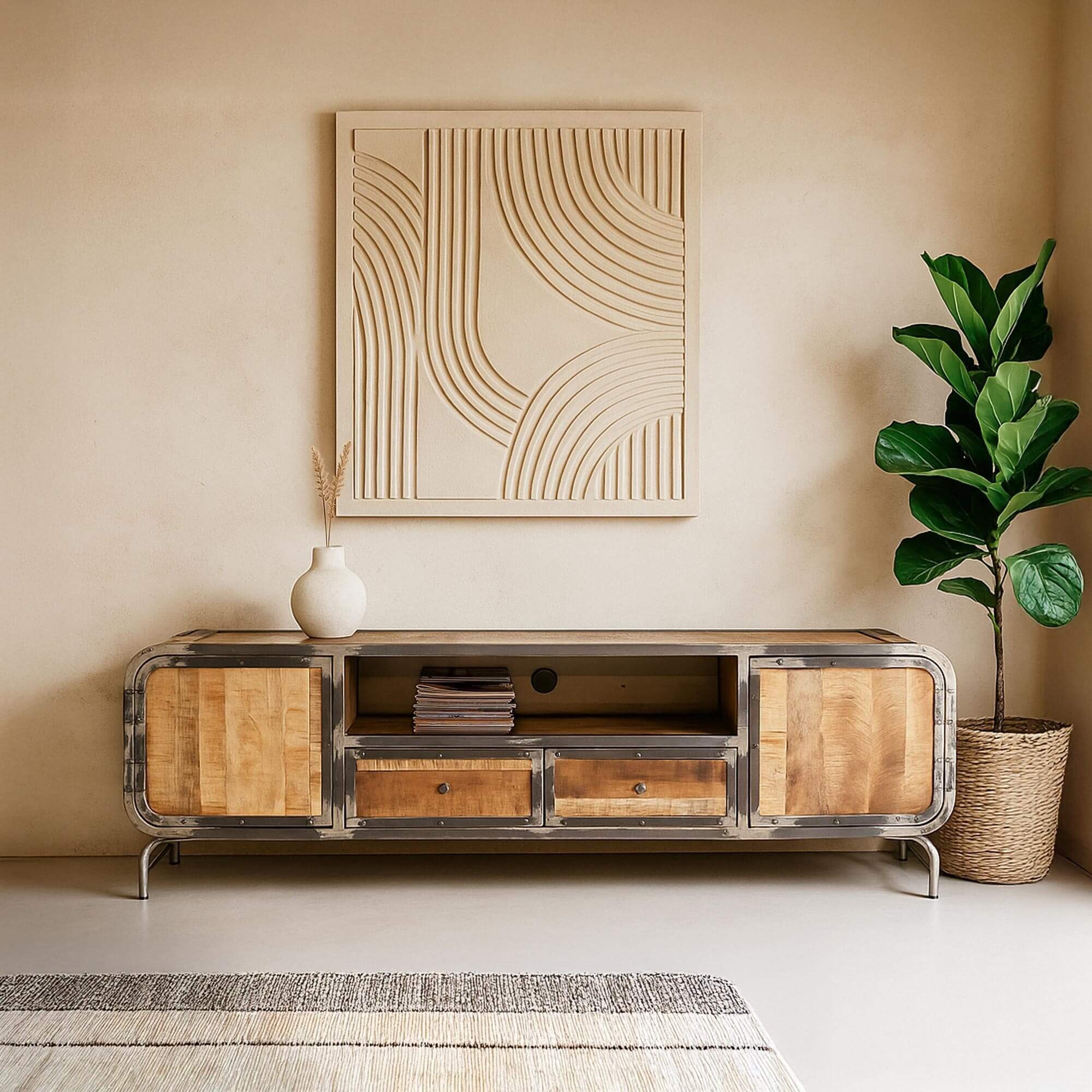 Elk detail van dit TV-meubel is zorgvuldig doordacht om de essentie van industriële stijl te vangen. De mangohouten panelen, met hun natuurlijke nerf en rijke tint, passen harmonieus bij het natuurlijke verroeste metaal, waardoor een opvallend visueel contrast ontstaat dat de rauwe charme van industriële ruimtes oproept.