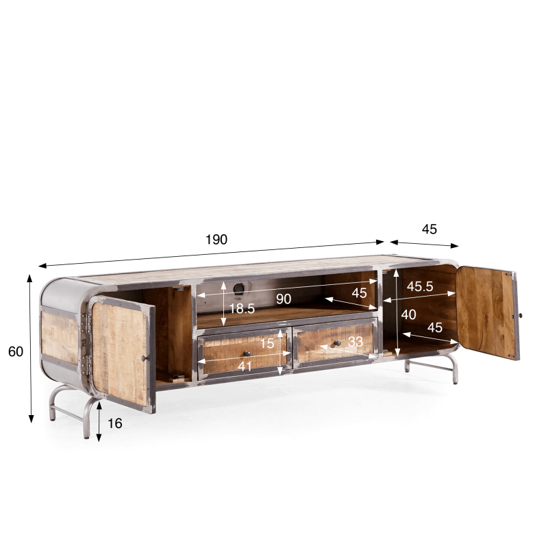 Ontdek de ultieme industriële stijl met ons massief houten en metalen TV-meubel uit de Manchester collectie, een boeiend stuk dat je woonruimte zal opfleuren met een dosis authenticiteit. Met een breedte van 190 cm, een hoogte van 60 cm en een diepte van 45 cm belichaamt dit meubel de perfecte balans tussen de kracht van metaal en de warmte van mangohout.