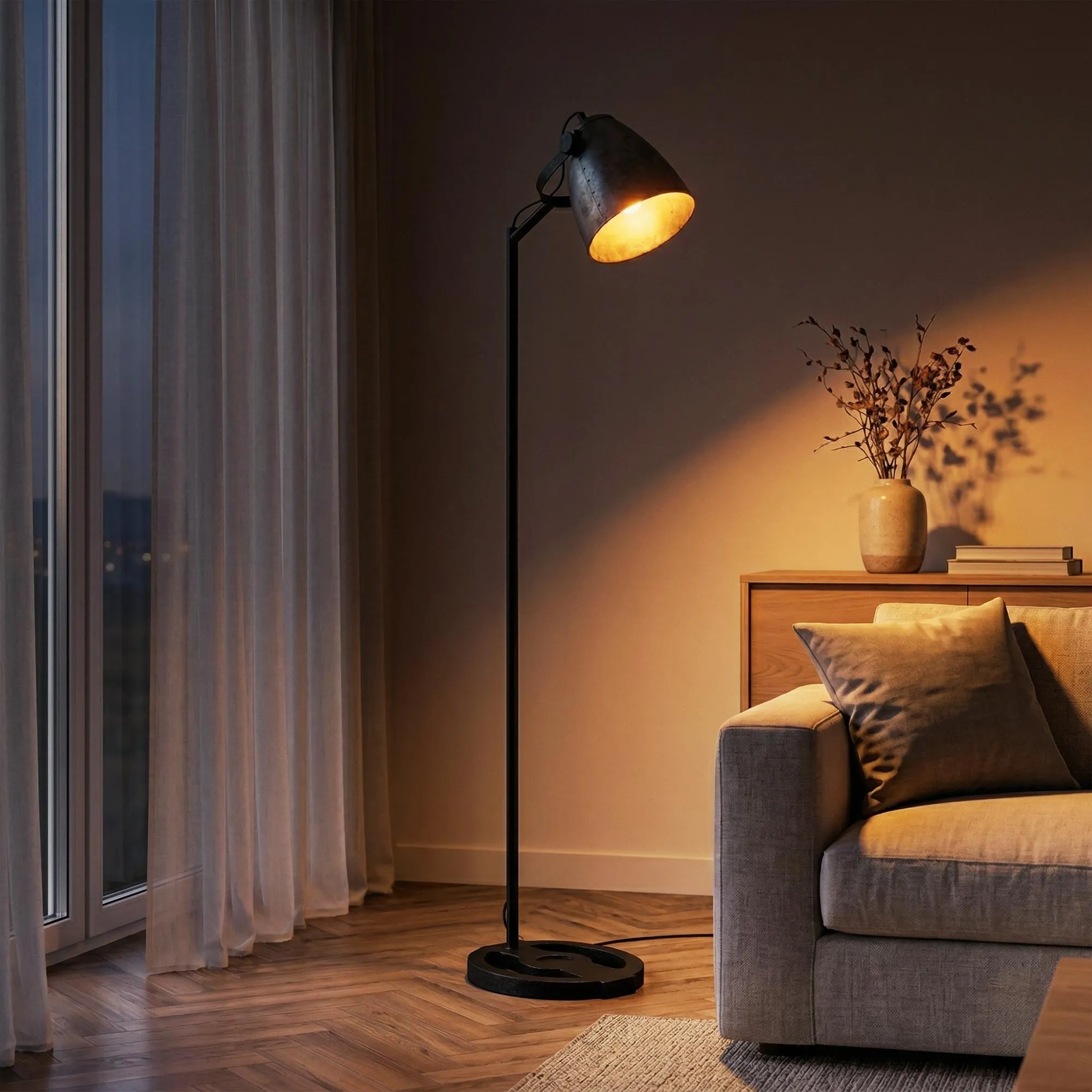 De Indiana industriële vloerlamp is een moderne armatuur die de nadruk legt op eenvoud en gerecycled metaal.