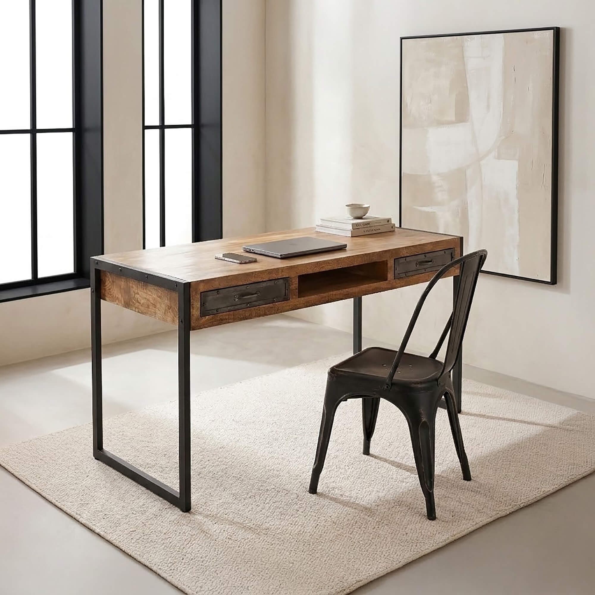 De romp van het bureau is gemaakt van massief mangohout. Aan weerszijden van de plank vindt u 2 zwart metalen laden. In het midden is er een open nis waar u uw documenten, toetsenbord, muis en andere kleine kantoorbenodigdheden die u snel bij de hand wilt hebben, kunt opbergen.
