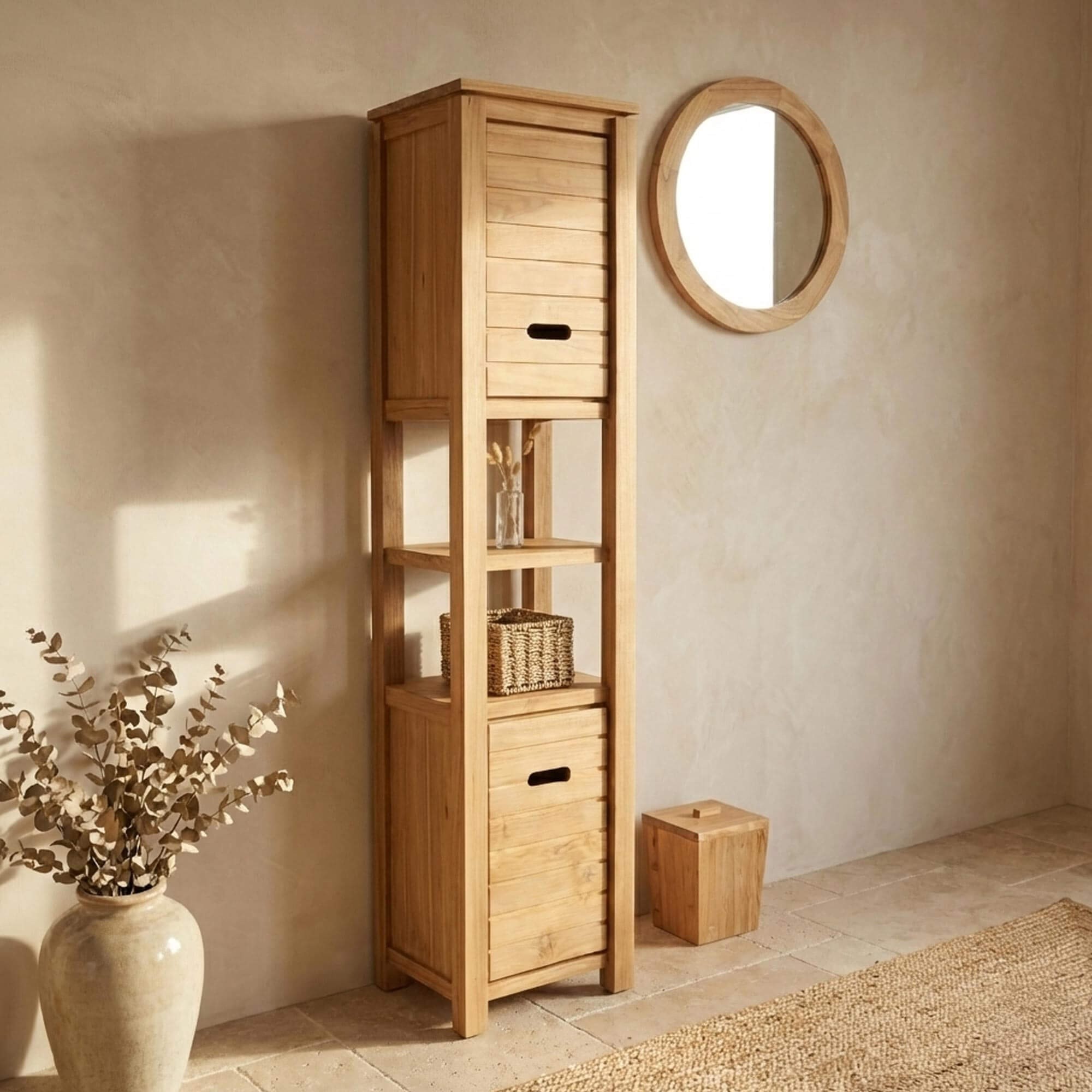 Deze badkamerkolom maakt deel uit van de Azur-collectie, een sober en chique ontwerp met een hoogwaardige teakhouten afwerking. Het is praktisch en elegant en biedt u mooie opbergruimtes voor uw schoonheidsproducten, badlinnen en andere badkameraccessoires.