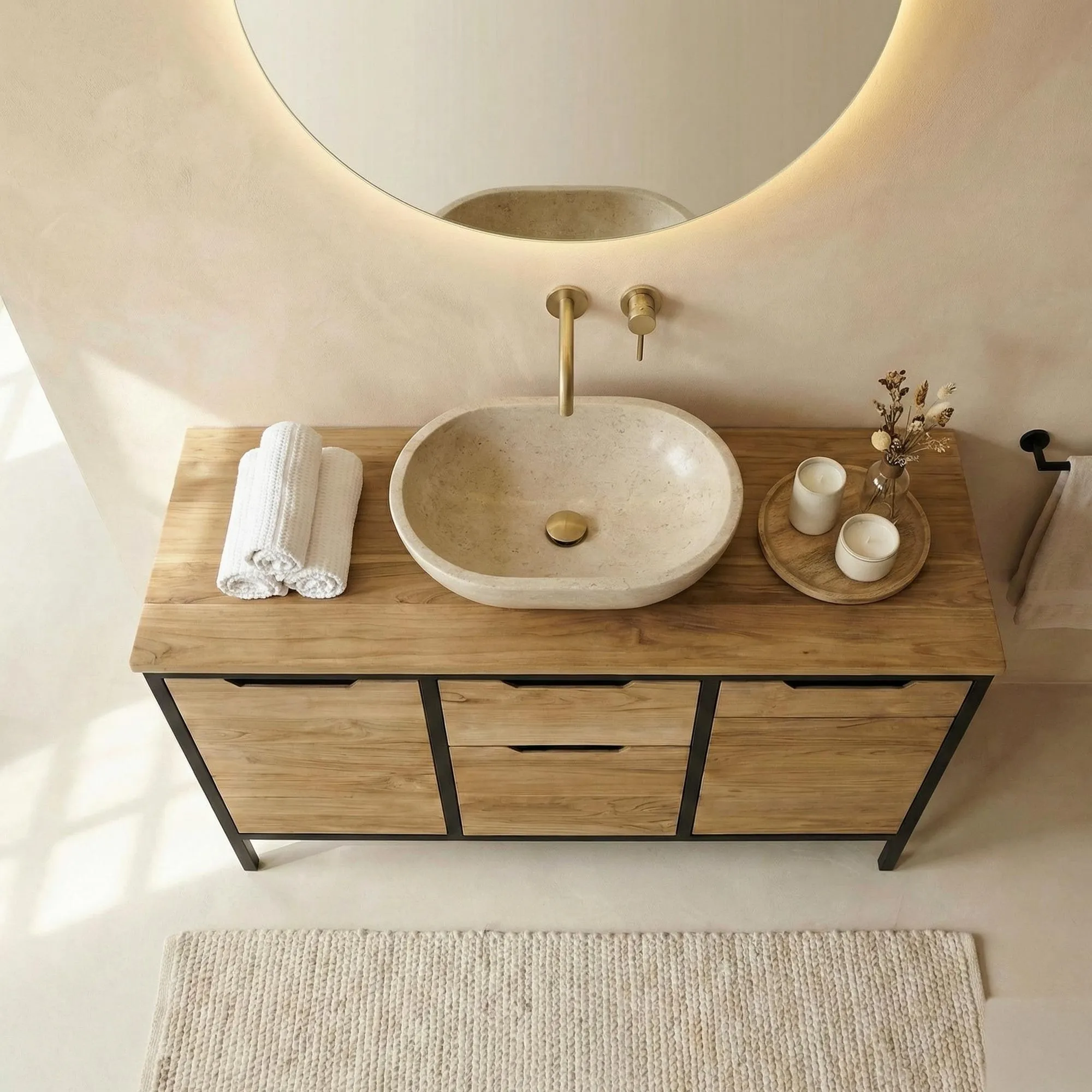 Dit meubel wordt verkocht zonder wastafel, met een ongeboord blad, zodat u de wastafel(s) van uw keuze erop kunt plaatsen. Kom en ontdek ons assortiment stenen wastafels om uw meubilair te verfraaien en uw eigen persoonlijke sfeer te creëren. Uw meubels zullen uniek zijn. De meubelen worden gemonteerd geleverd, u hoeft ze alleen nog maar te installeren op de plaats van uw keuze. U kunt in onze catalogus ook een ruime keuze aan spiegels en accessoires ontdekken die bij al onze badkamermeubels kunnen worden gevoegd.