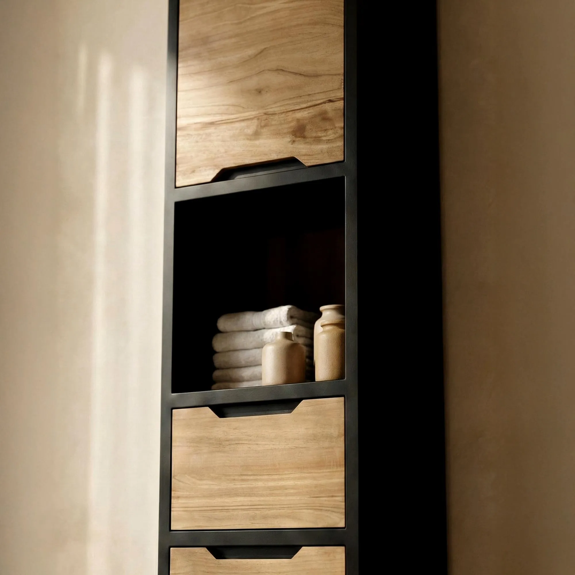 Deze badkamerkolom maakt deel uit van de Bold collectie. Het is gemaakt van massief teakhout en metaal en biedt een mooie opbergruimte voor uw schoonheidsproducten, handdoeken en andere badkameraccessoires. Zijn eigentijdse look zal een opvallende entree maken in een modern interieur.