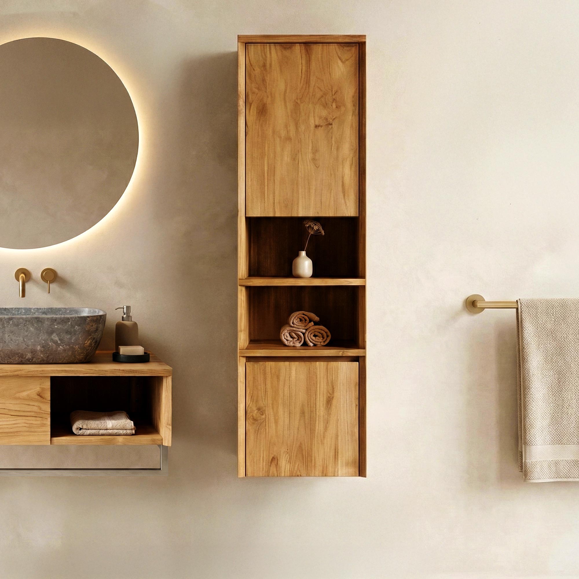 Deze badkamerkast maakt deel uit van de Hako-collectie, met zijn authentieke, natuurlijke uitstraling en hoogwaardige teakhouten afwerking. Hij is praktisch en elegant en biedt voldoende opbergruimte voor je schoonheidsproducten, badlinnen en andere badkameraccessoires.