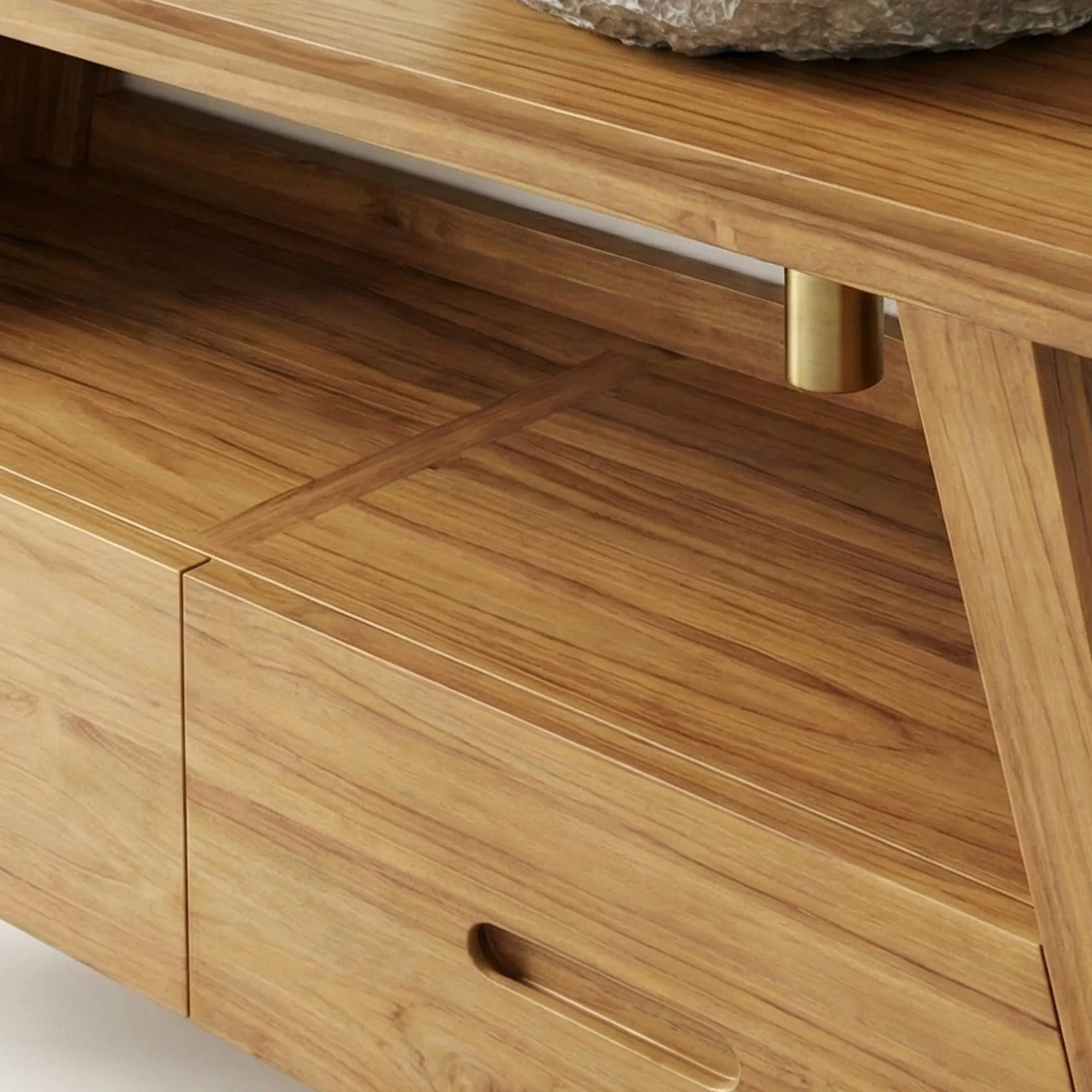 Dit badkamermeubel is zorgvuldig vervaardigd uit massief teakhout en belichaamt de natuurlijke schoonheid en opmerkelijke veerkracht van exotisch hout. De afwerking in teak versterkt het authentieke, elegante uiterlijk, terwijl het unieke trapezepootontwerp een vleugje moderne verfijning toevoegt.