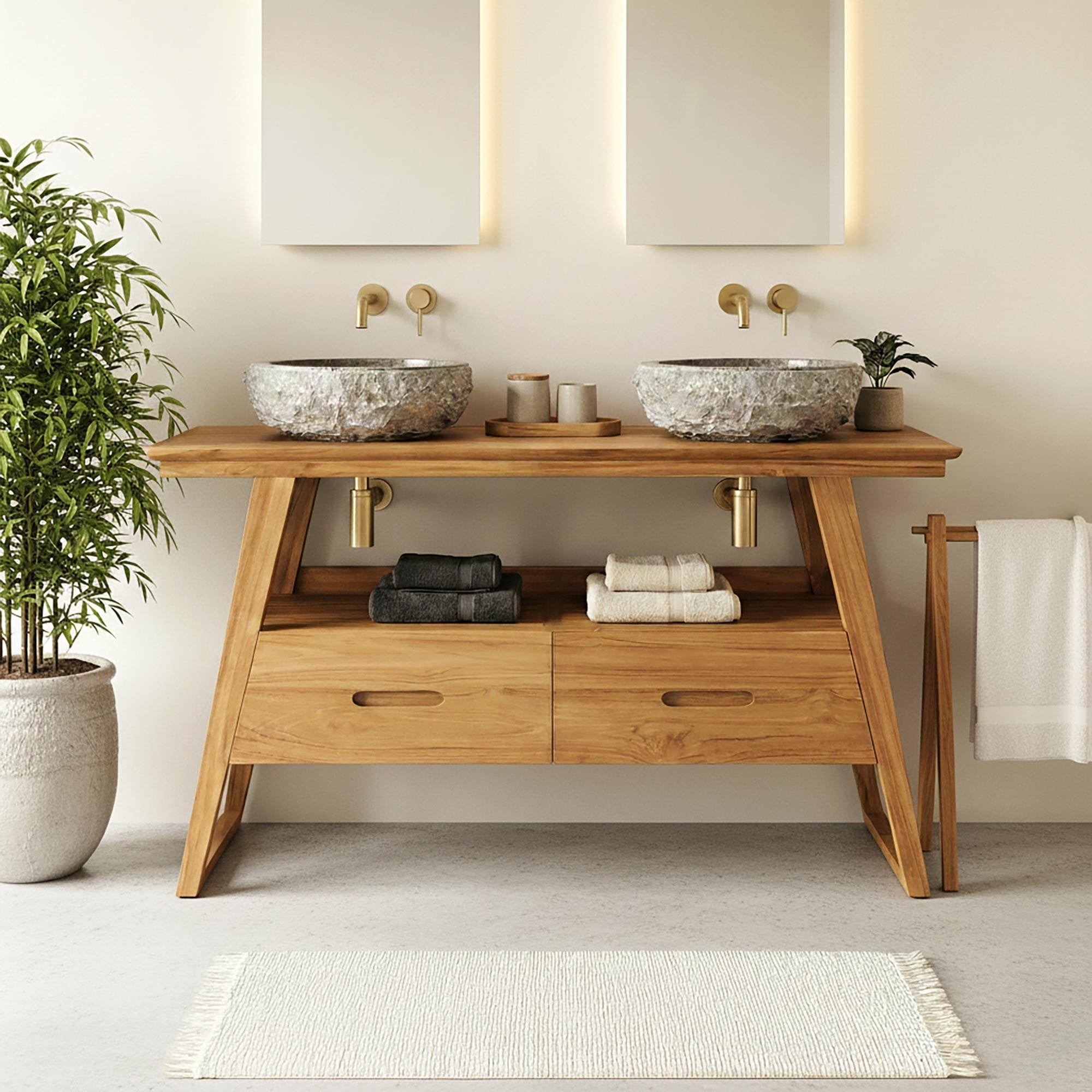 Ontdek het teakhouten badkamermeubel met dubbele wastafel uit de Mizu collectie, een pronkstuk dat een vleugje elegantie en functionaliteit in je badkamer brengt. Met zijn royale afmetingen van 120 cm breed, 80 cm hoog en 50 cm diep is dit meubel speciaal ontworpen voor twee wastafels en biedt het een praktische en comfortabele ruimte voor stellen en gezinnen.