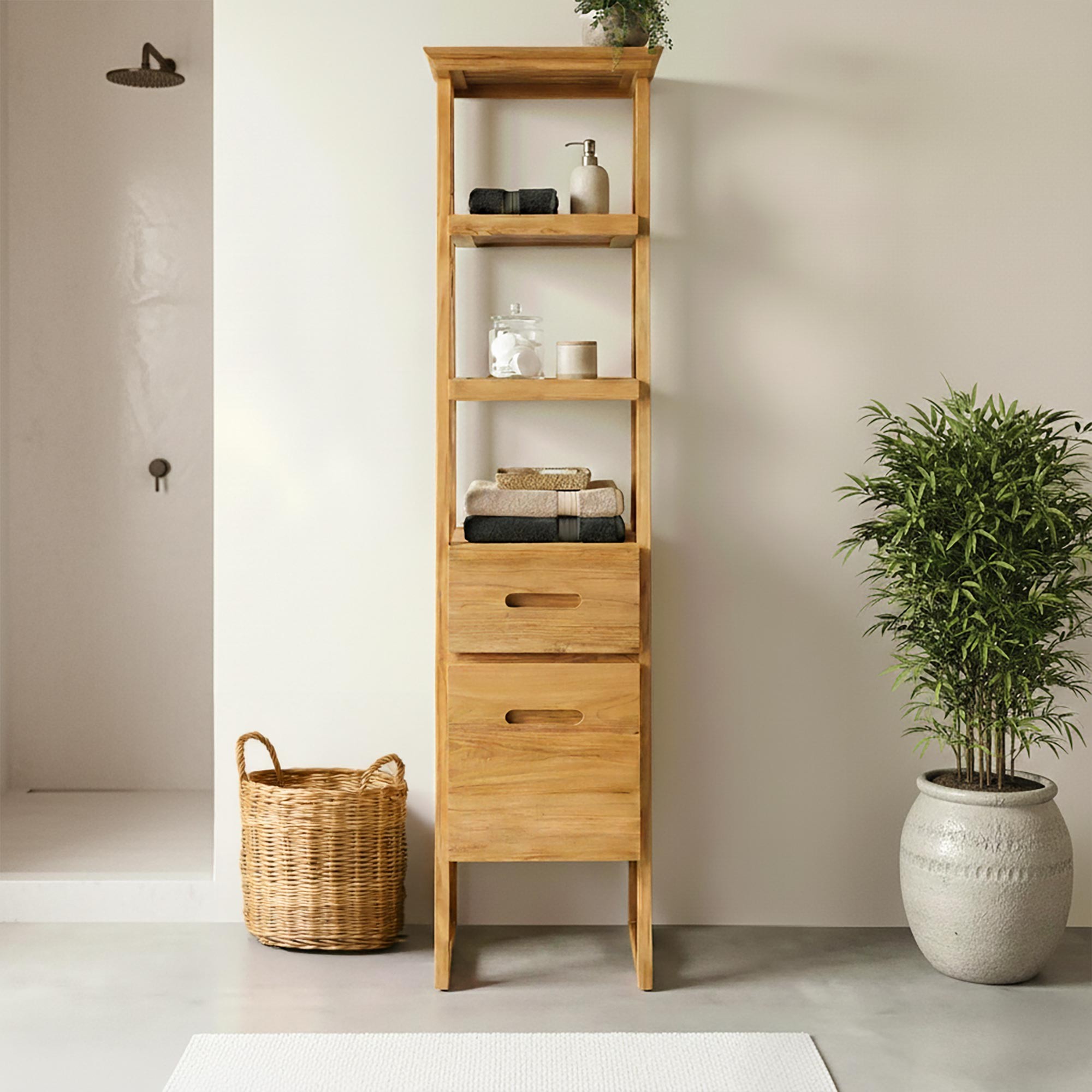 Meteen na plaatsing, zonder montage, integreert de badkamerkolom in massief teakhout zich harmonieus in uiteenlopende badkamerstijlen – natuurlijk, hedendaags of minimalistisch. Ontworpen voor dagelijks gebruik belichaamt ze onze wens om meubels te creëren die zowel praktisch zijn als bezield, en die de eenvoudige schoonheid van hout en vakmanschap waarderen.