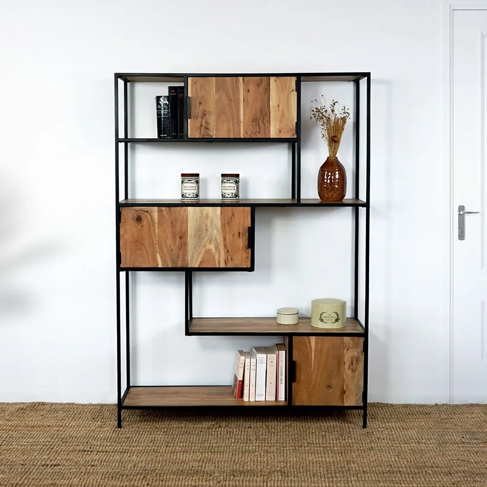 Industriële boekenplank van hout en metaal met deuren