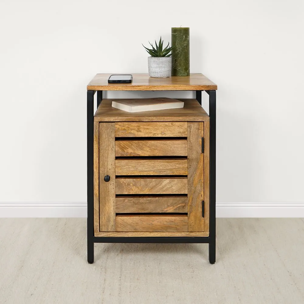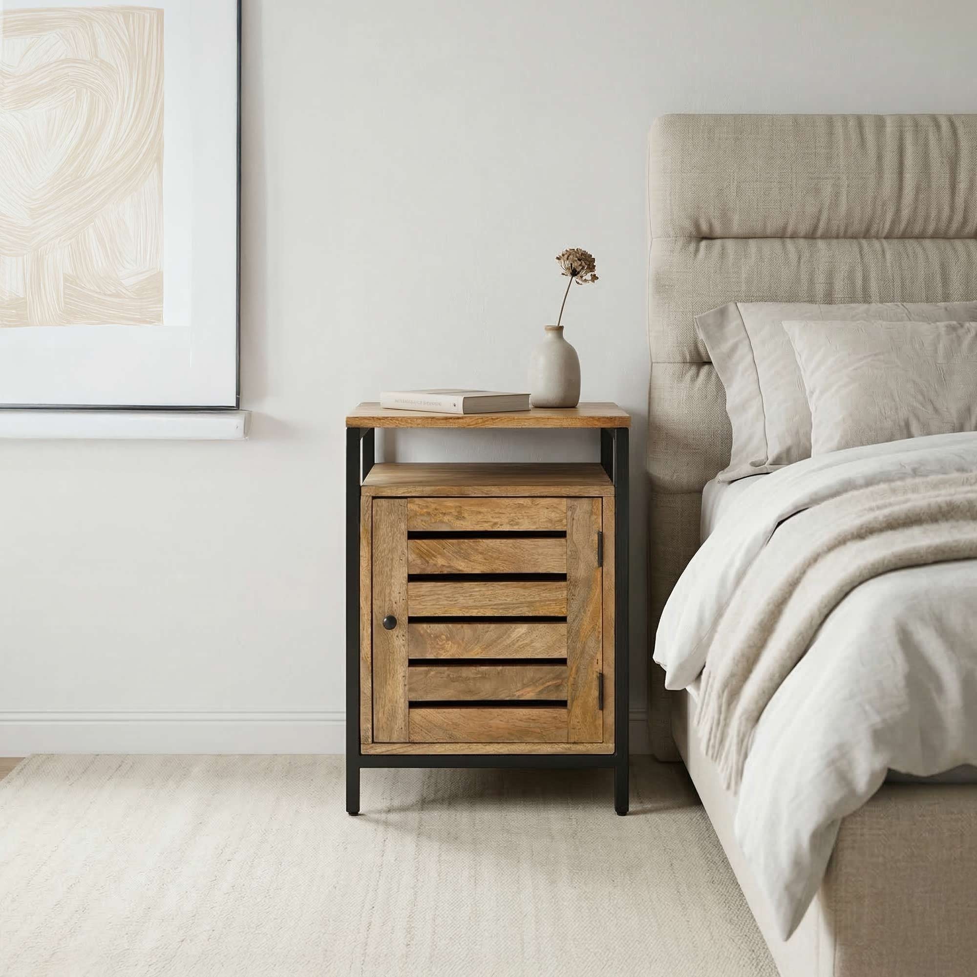 Dit nachtkastje van natuurlijk hout en metaal combineert rustieke elegantie met moderne functionaliteit, en is een eerbetoon aan de industriële stijl met elementen van boerderijontwerp. Het meubel is gemaakt van massief mangohout, bekend om zijn robuustheid en rijke nerf, waardoor het een uitgesproken karakter en warme aanwezigheid heeft in elke slaapkamer.