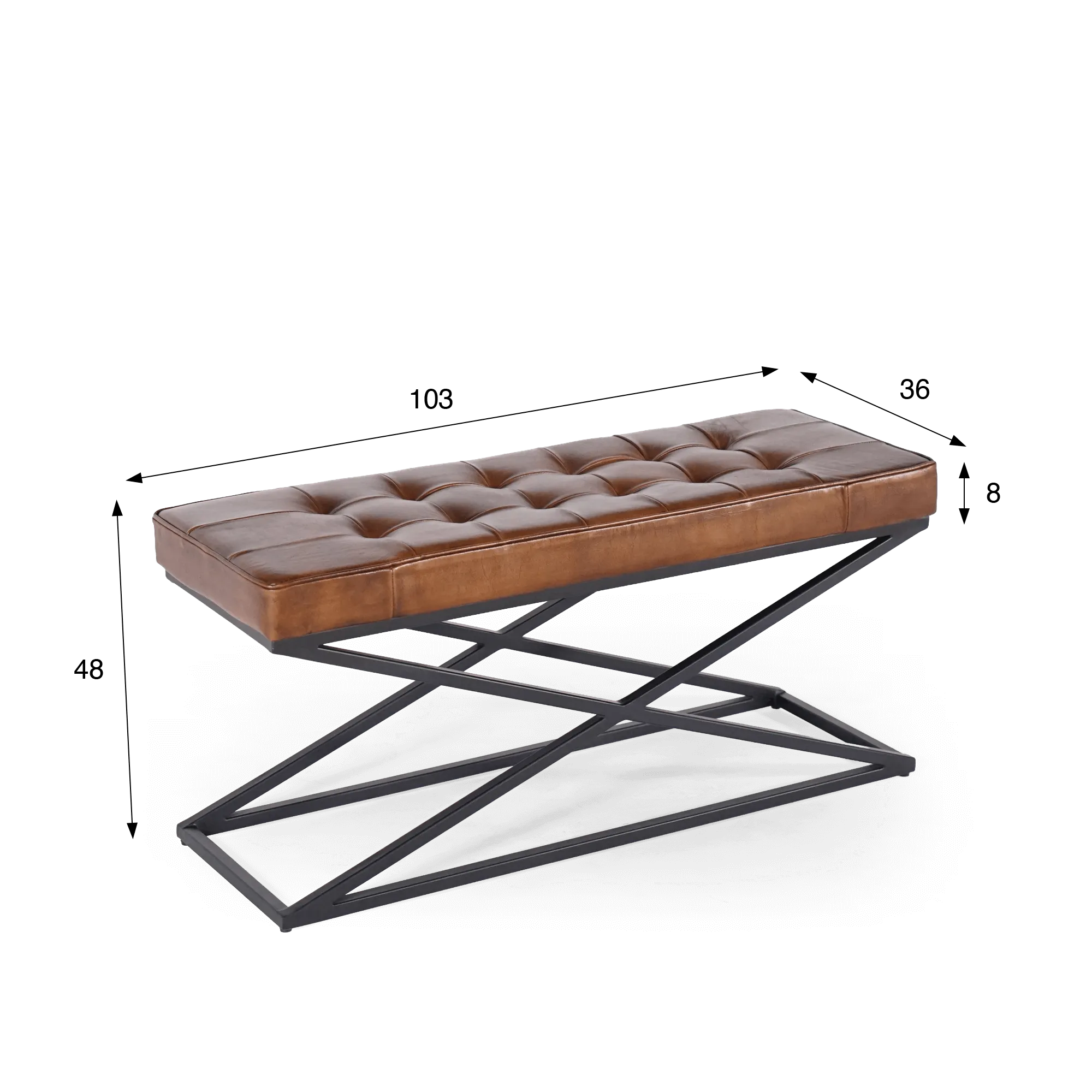 Op het kruispunt van industrieel en hedendaags design: ontdek onze bank in natuurlijk leer en metaal Clay. Deze bank heeft praktische afmetingen van 103 cm breed, 36 cm diep en een hoogte die perfect past bij uiteenlopende opstellingen. Het onderstel in zwart metaal, uit één stuk gevormd, toont een atypisch silhouet met een geometrische kruisstructuur die meteen in het oog springt en zorgt voor een voorbeeldige stabiliteit.