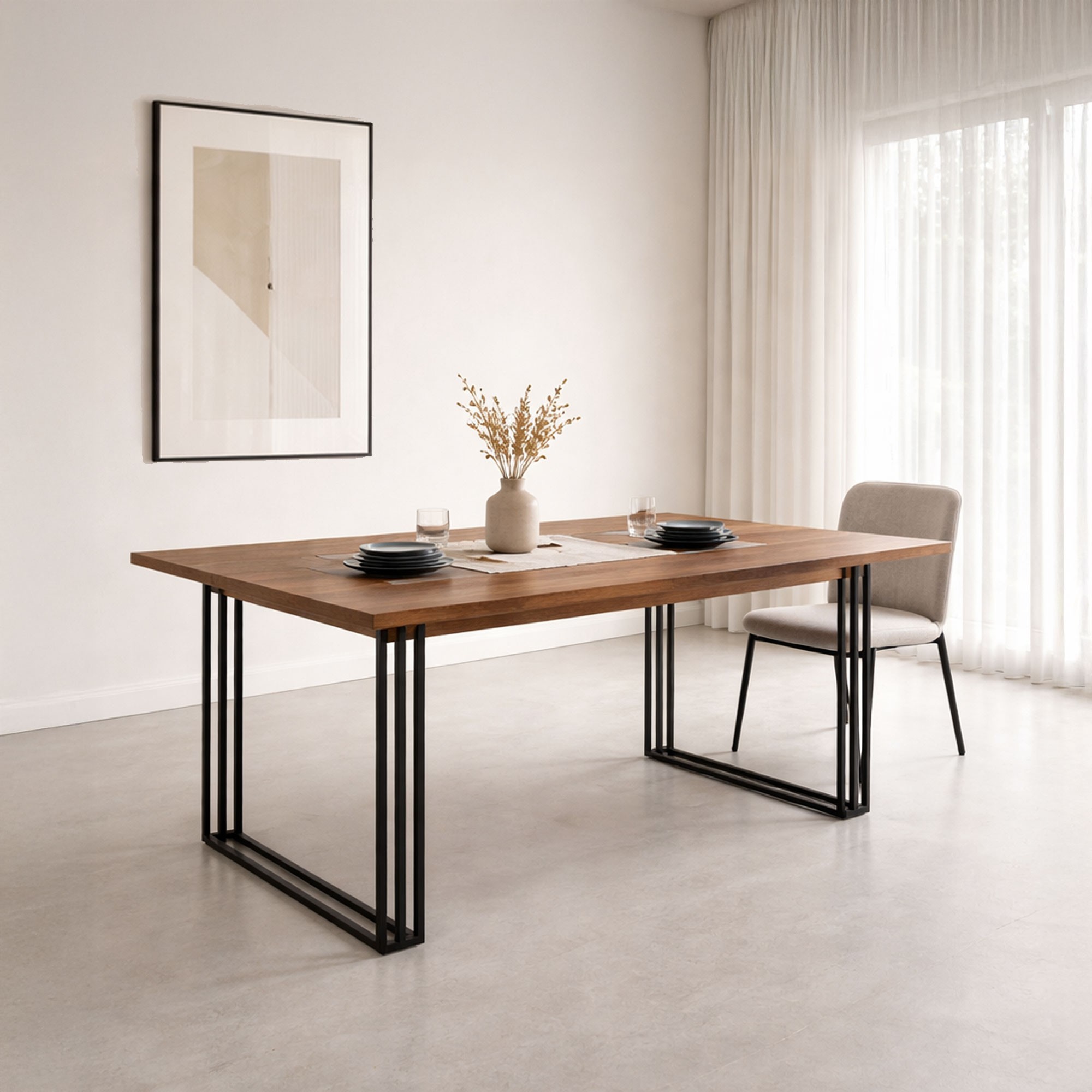 Misschien wel het meest opvallende aspect van de 'Queens' zijn de metalen poten, die opvallen door hun atypische ontwerp. Hun slanke maar stevige geometrische structuur voegt een vleugje industrieel chic toe dat erg in de mode is. Het zwart afgewerkte metaal contrasteert elegant met het houten blad en geeft het geheel een moderne, verfijnde touch.