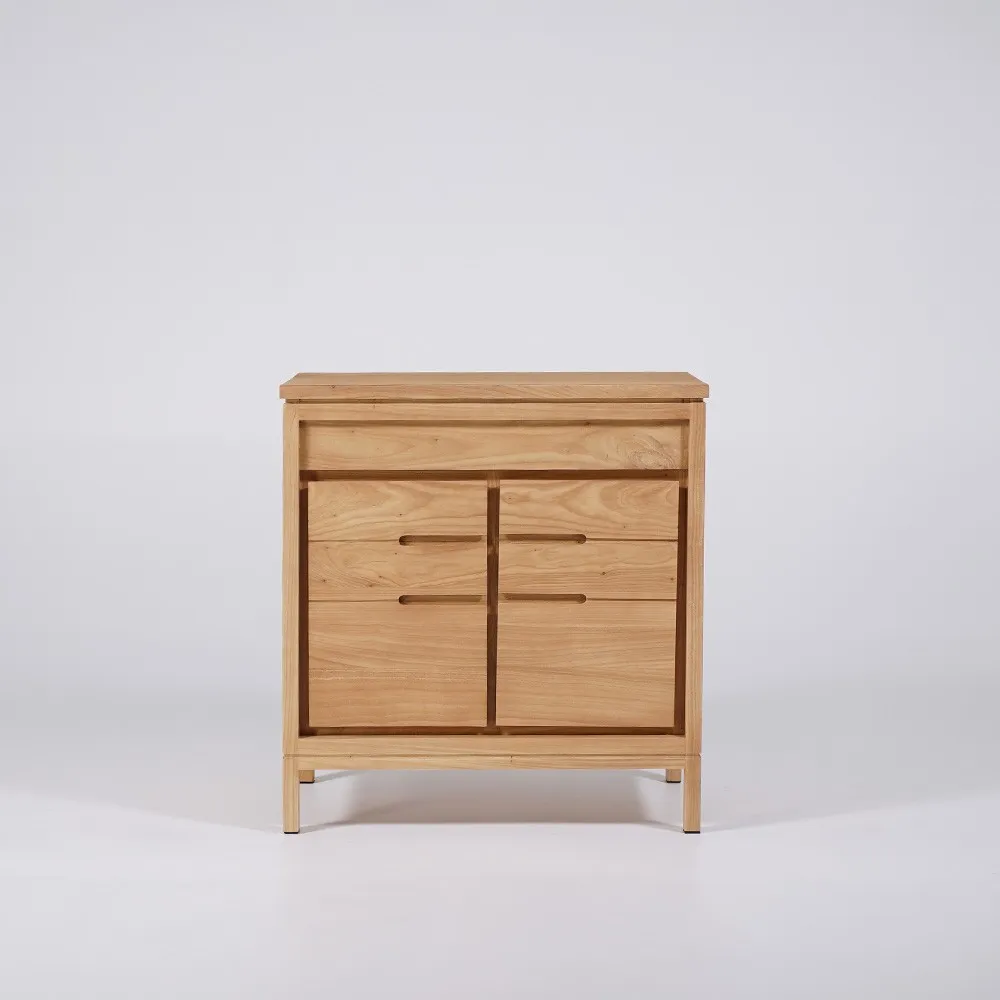 De strakke lijnen en discreet geïntegreerde handgrepen laten een strak, modern Scandinavisch ontwerp zien. De massief houten poten zorgen voor stabiliteit en een visuele lichtheid die je ruimte verbetert. De natuurlijke afwerking benadrukt de unieke nerven van het hout, waardoor elk meubel een eigen karakter krijgt.