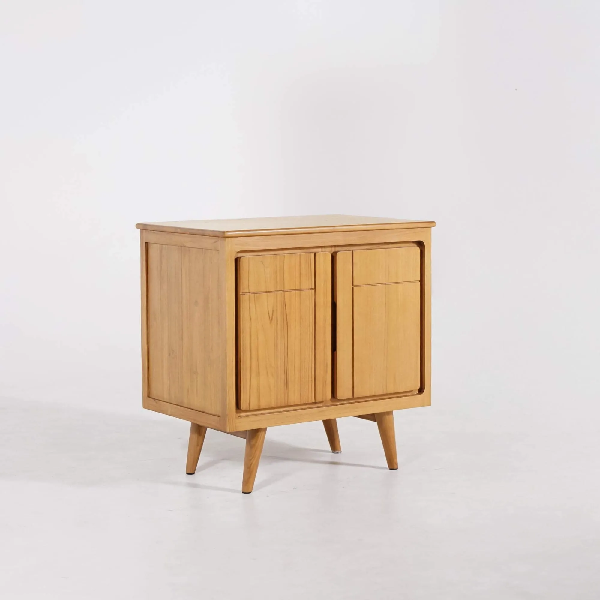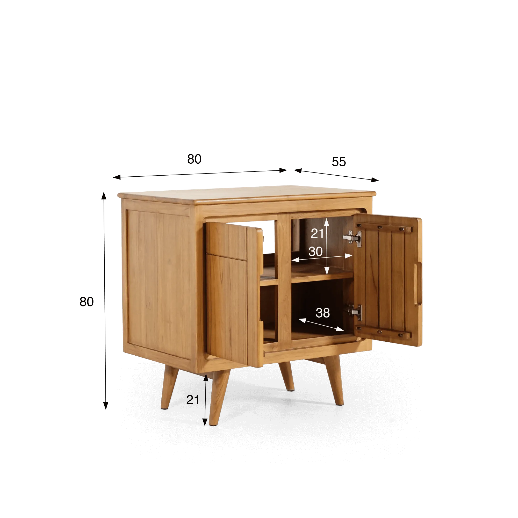 Met zijn 80 cm lengte, 55 cm diepte en 80 cm hoogte biedt dit badkamermeubel in massief teakhout een compact silhouet dat perfect past in hedendaagse ruimtes. De twee draaideuren verbergen een royale opbergruimte, verdeeld over twee niveaus: het eerste schap op 30 cm van het blad is ideaal voor flacons en verzorgingsaccessoires dankzij de bruikbare diepte van 38 cm, terwijl het onderste compartiment, met dezelfde afmetingen, handdoeken en andere grotere producten kan herbergen.