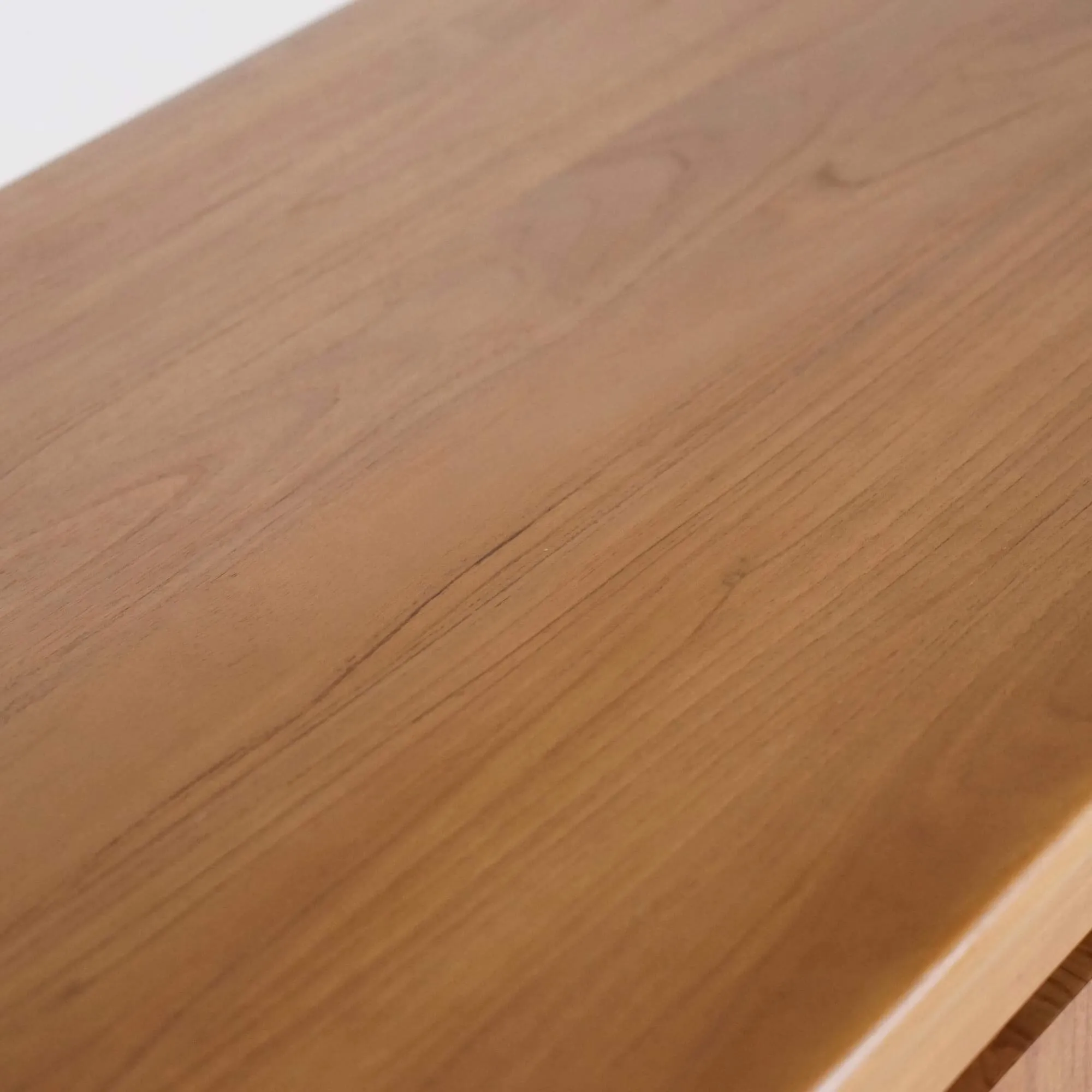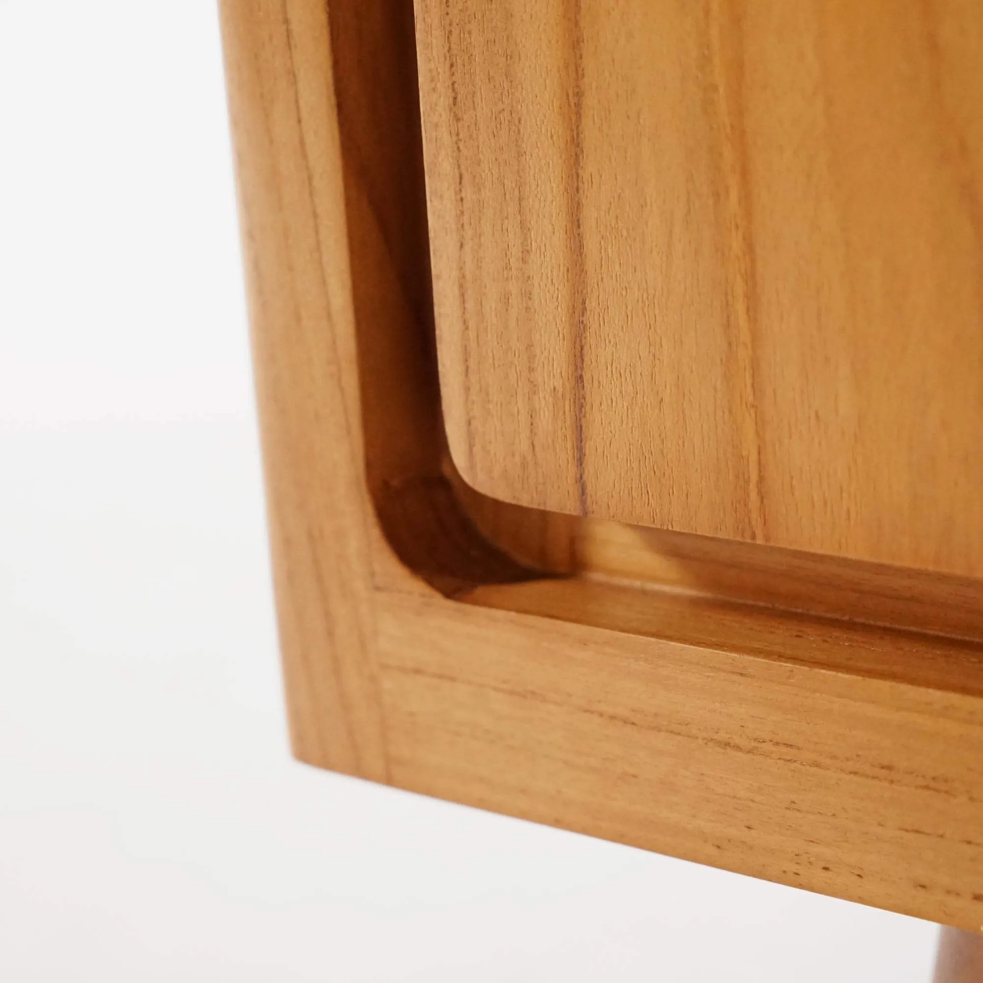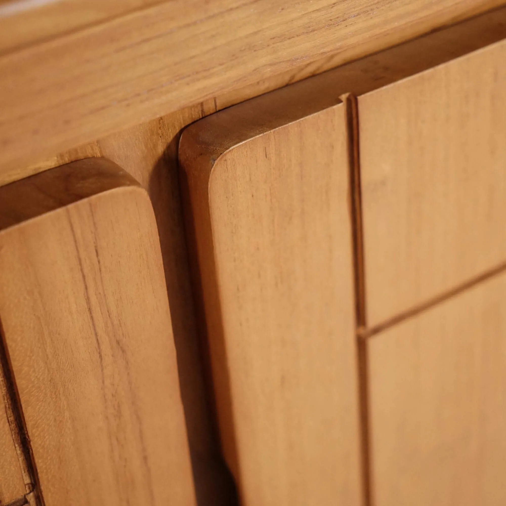 Elk detail van dit badkamermeubel in massief teakhout is zorgvuldig ontworpen om het materiaal te laten spreken. Het massieve teakhout, geselecteerd om zijn dichtheid en natuurlijke weerstand tegen vocht, onthult een subtiele en warme nerfstructuur. De afgeronde randen, zachte hoeken en satijnen afwerking getuigen van een nauwgezet ambachtelijk vakmanschap, trouw aan onze kwaliteitsnormen. Het meubel rust op conische poten van 21 cm, die zorgen voor een visuele lichtheid en het onderhoud van de vloer vergemakkelijken.