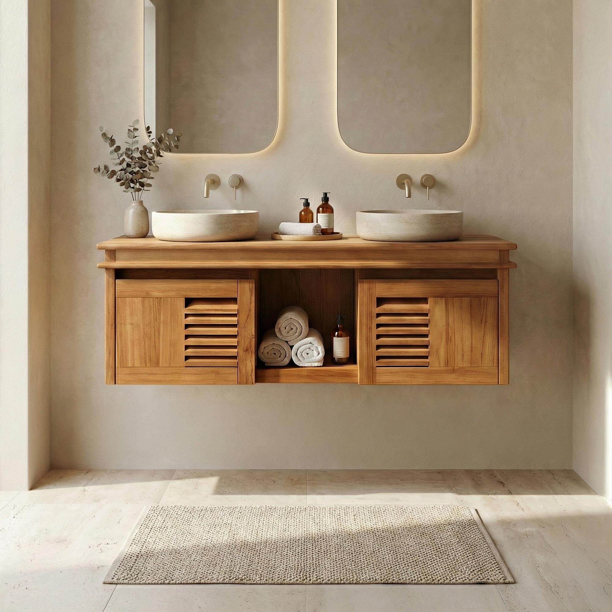 Ontdek het 120 cm dubbele waskom badkamermeubel uit de Mira collectie, een creatie die Scandinavisch design en functionaliteit op elegante wijze combineert. Dit meubel is gemaakt van massief teakhout en bekoort door zijn natuurlijke schoonheid en strakke lijnen, waardoor het de perfecte aanvulling is voor een warme, moderne badkamer.