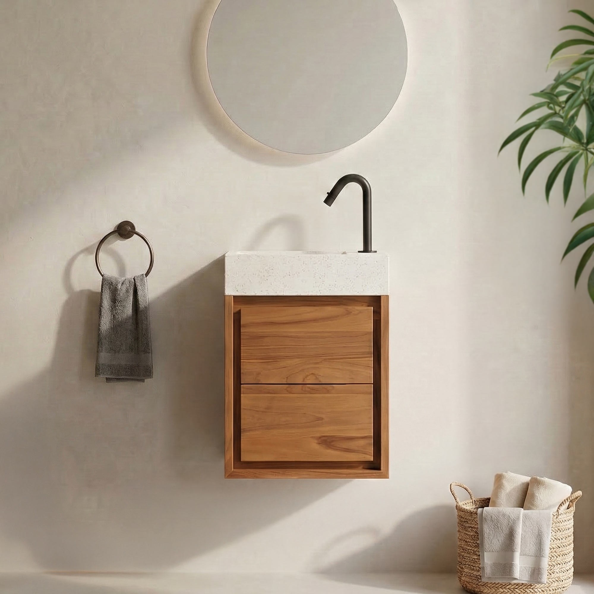 Met zijn compacte afmetingen (40 cm breed, 20 cm diep en 55 cm hoog, inclusief de fontein) is het badmeubel Tanvi ideaal als aanvulling op je toilet en biedt het een discrete en esthetische oplossing. De 10 cm hoge wastafel in wit terrazzo past perfect bij de eenheid en voegt een eigentijds tintje toe.