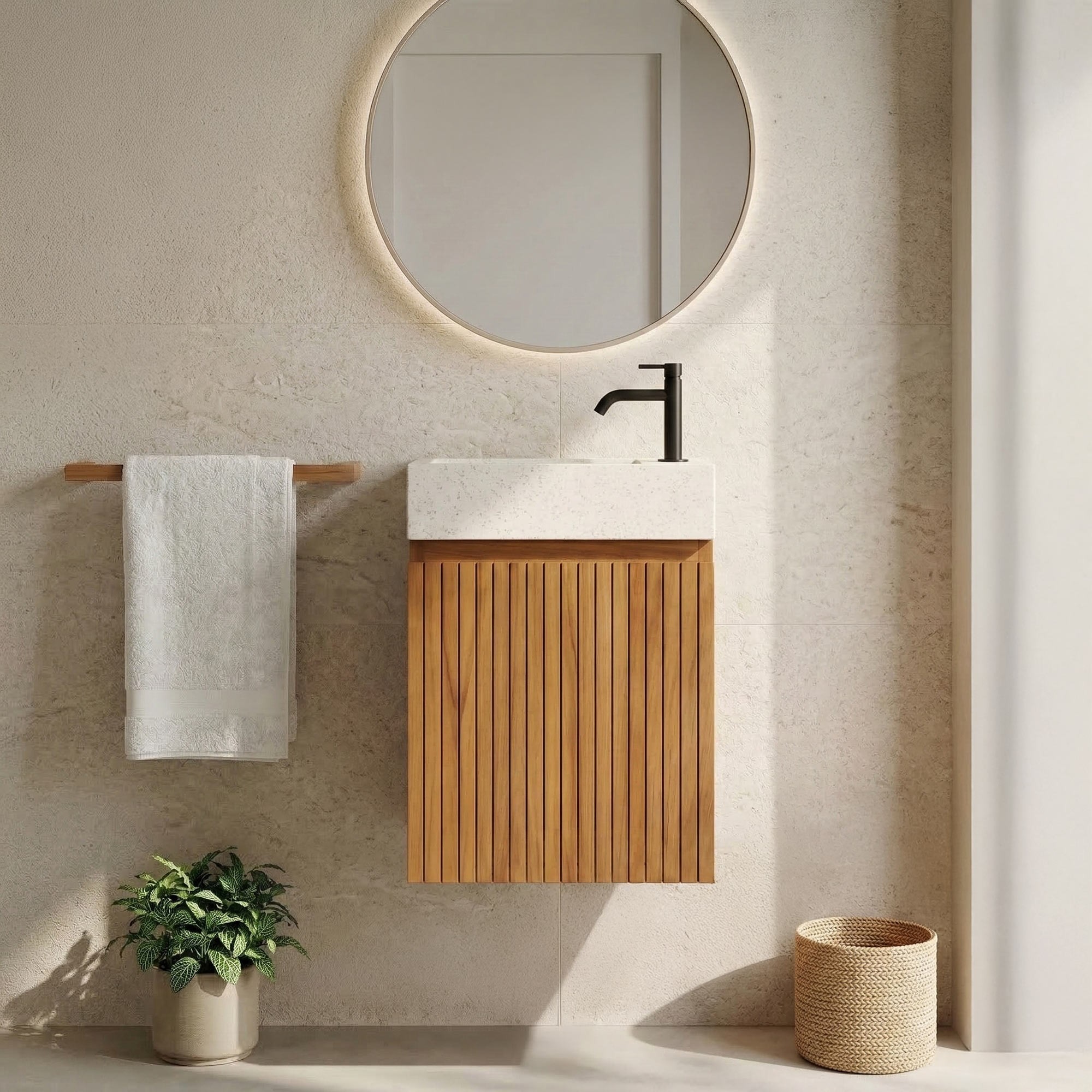 Hangwastafel van massief teakhout met witte terrazzowastafel - Trishna