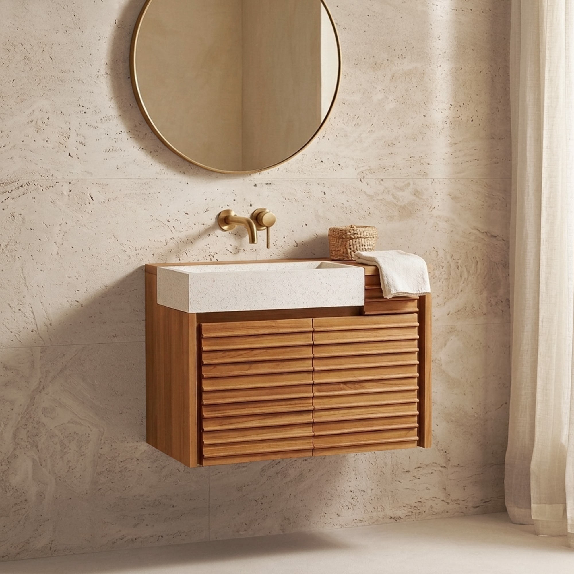 Hangwastafel van massief teakhout met witte terrazzowastafel - Trilochana