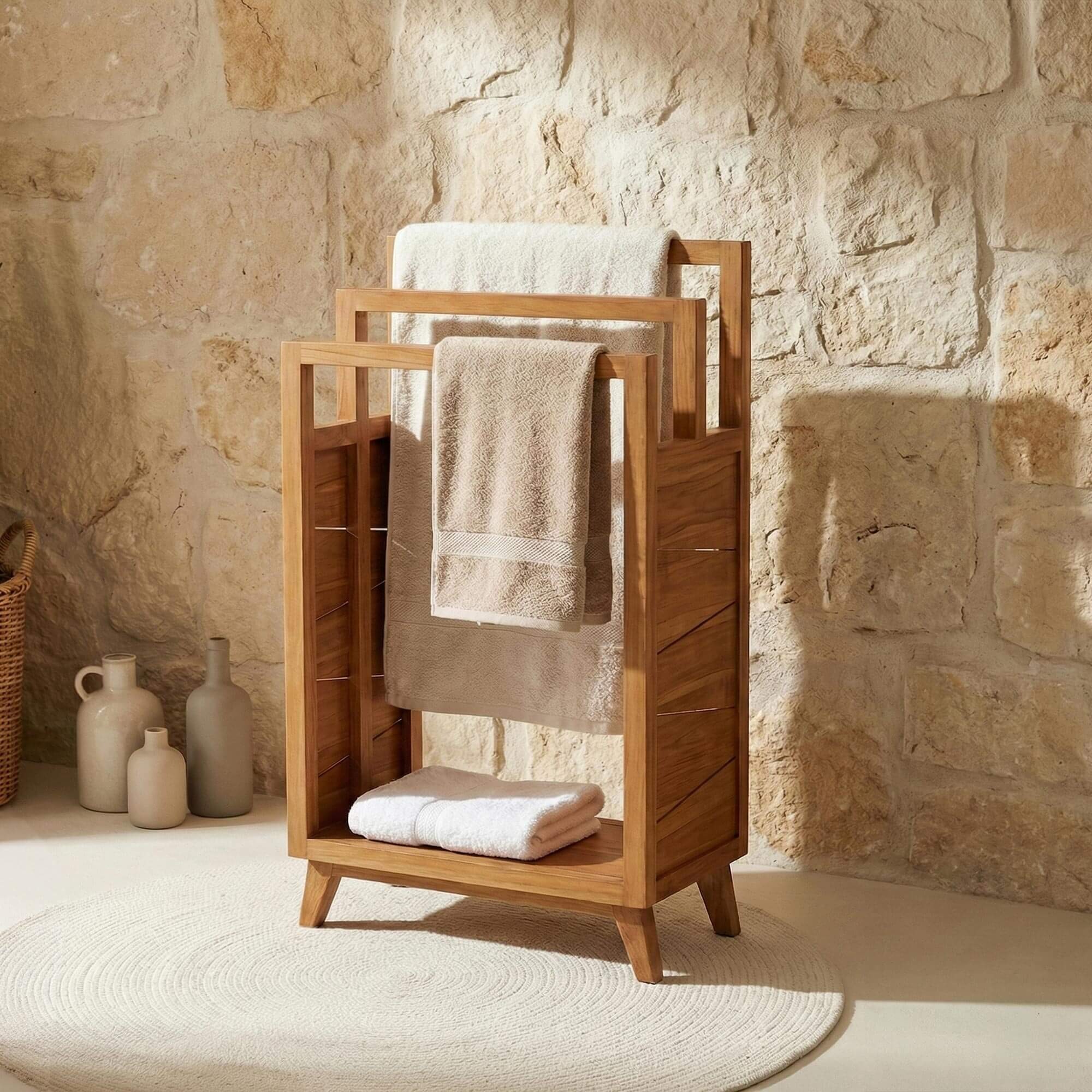 We wilden een accessoire maken dat zowel functioneel als esthetisch is, zodat je je handdoeken optimaal kunt organiseren en tegelijkertijd een designertouch aan je interieur kunt toevoegen. Elk detail, van de onberispelijke afwerking tot de geometrische vormen van de structuur, is doordacht om een aangename gebruikerservaring te bieden en om perfect te harmoniëren met de andere stukken uit de Meera-collectie, zoals het massief teakhouten badkamermeubel.
