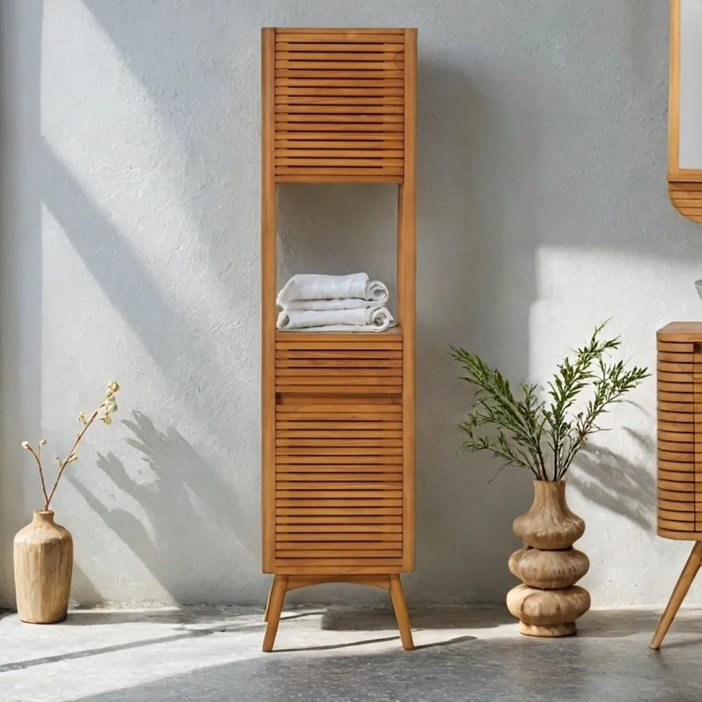 Het massief teakhout dat voor dit meubel werd gekozen, is uitzonderlijk robuust en heeft een warme esthetische uitstraling. De natuurlijke nerf, subtiel versterkt door een gladde afwerking, geeft deze kolom een unieke uitstraling. De textuur van het hout wordt versterkt door de horizontale latten, die reliëf en vakmanschap toevoegen aan het geheel. De poten, ook van massief teakhout, verlengen de natuurlijke harmonie van het ontwerp en garanderen een perfecte stabiliteit.