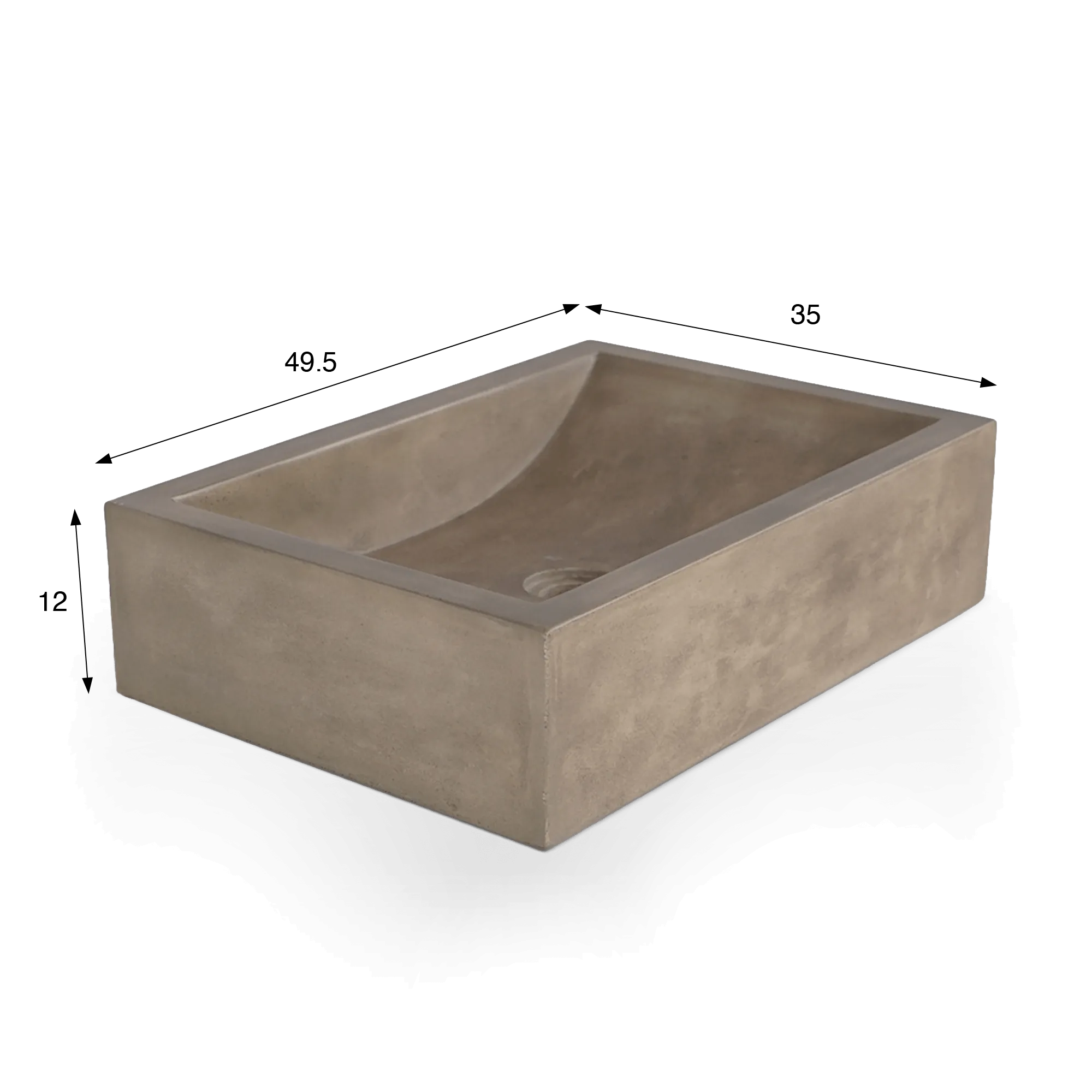 Met zijn ideale afmetingen van 49,5 cm breed, 35 cm diep en 12 cm hoog maakt deze vrijstaande waskom optimaal gebruik van de ruimte en voegt hij een sterke visuele aanwezigheid toe. Natuurlijk beton, met zijn authentieke, tijdloze tinten, past perfect bij meubels van hout, marmer of steen voor een rustgevende, harmonieuze sfeer.