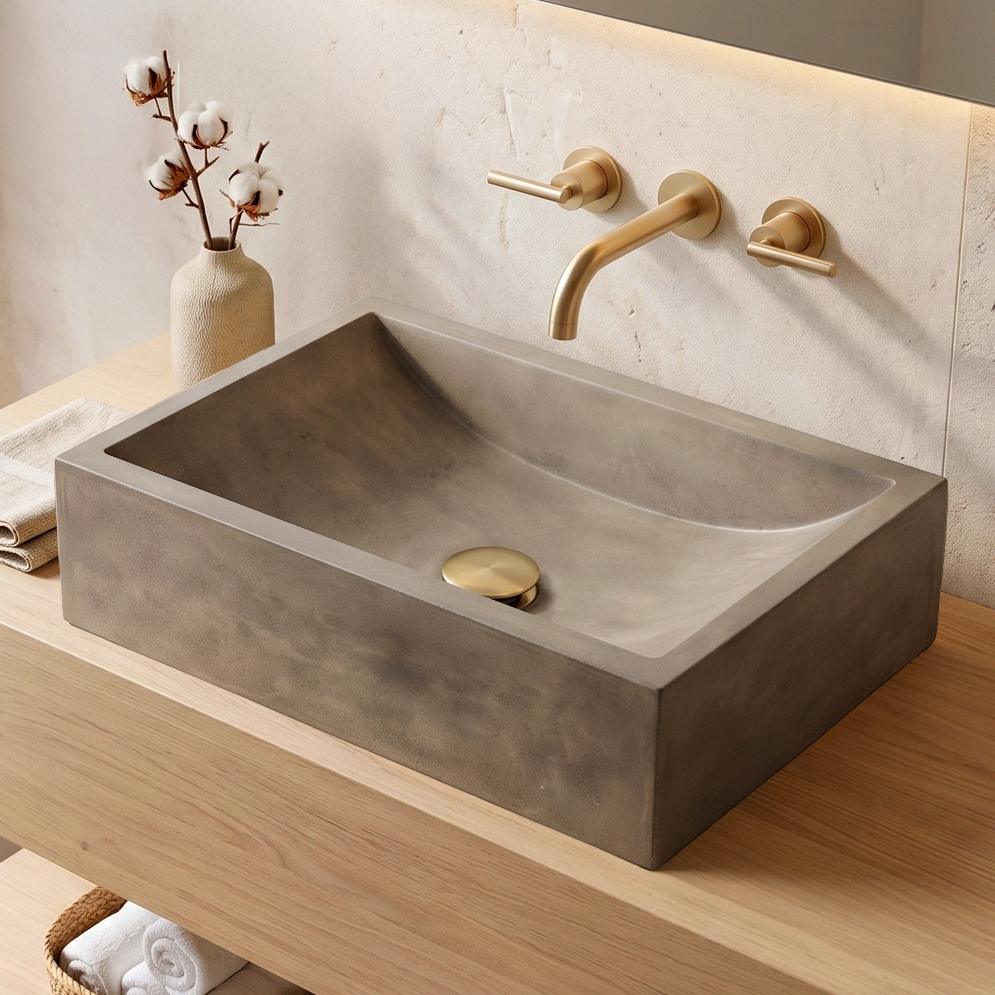 De Pure Cast betonnen waskom in natuurlijke kleur viert de puurheid van ruwe materialen in een minimalistisch rechthoekig ontwerp. Met zijn strakke lijnen en zachte kleur roept hij de ingetogen elegantie op van een hedendaagse badkamer waar eenvoud en verfijning elkaar ontmoeten.