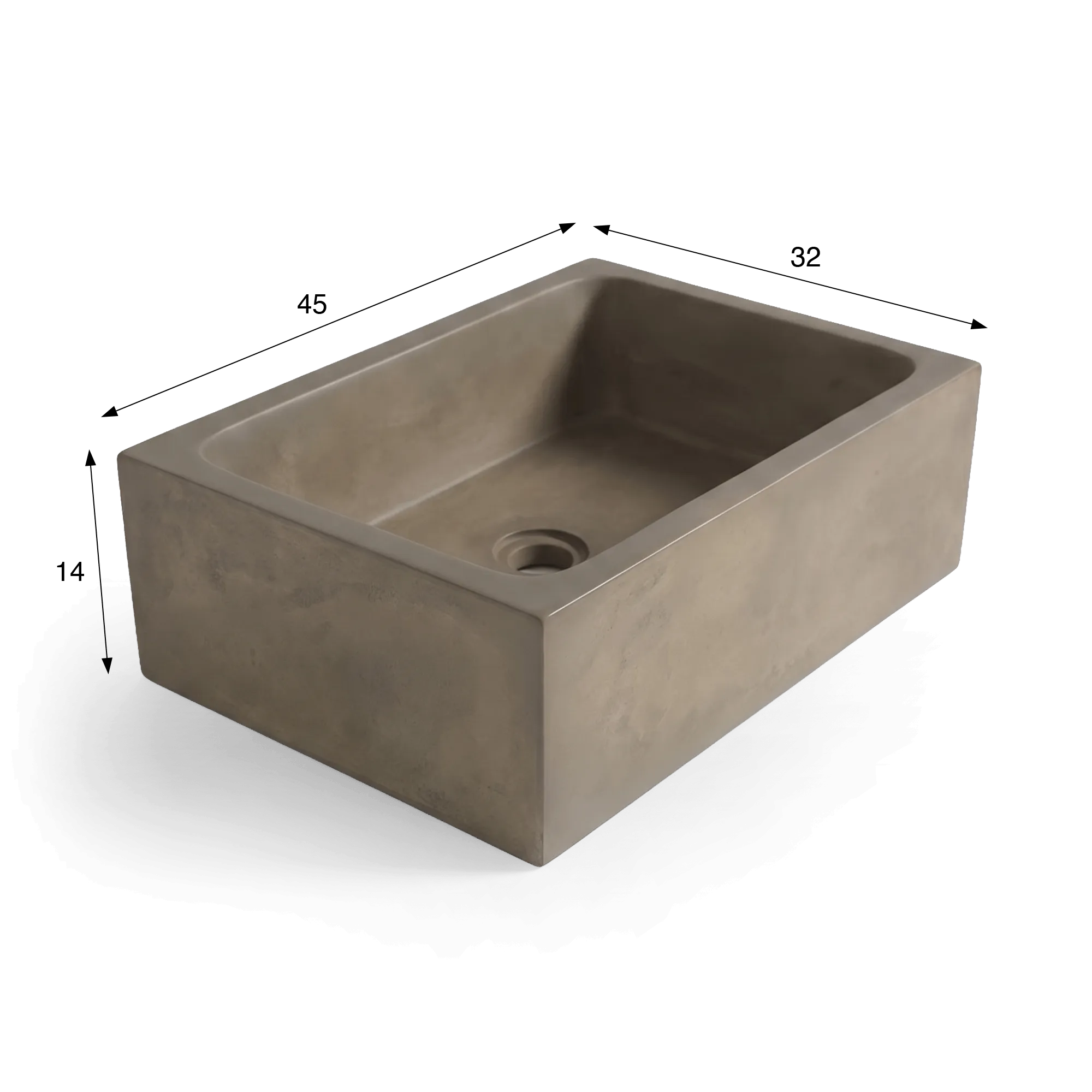 Deze 45 cm brede, 32 cm diepe en 14 cm hoge wastafel is handgemaakt van naturelkleurig beton en belichaamt de perfecte combinatie van robuustheid en verfijning. De keuze voor beton, een ruw en tijdloos materiaal, geeft het een uitzonderlijke stevigheid terwijl het de subtiele nuances en gladde, onberispelijke afwerking benadrukt. De natuurlijke kleur voegt een zachte, heldere toets toe, ideaal om een rustgevende, warme sfeer in je ruimte te creëren.