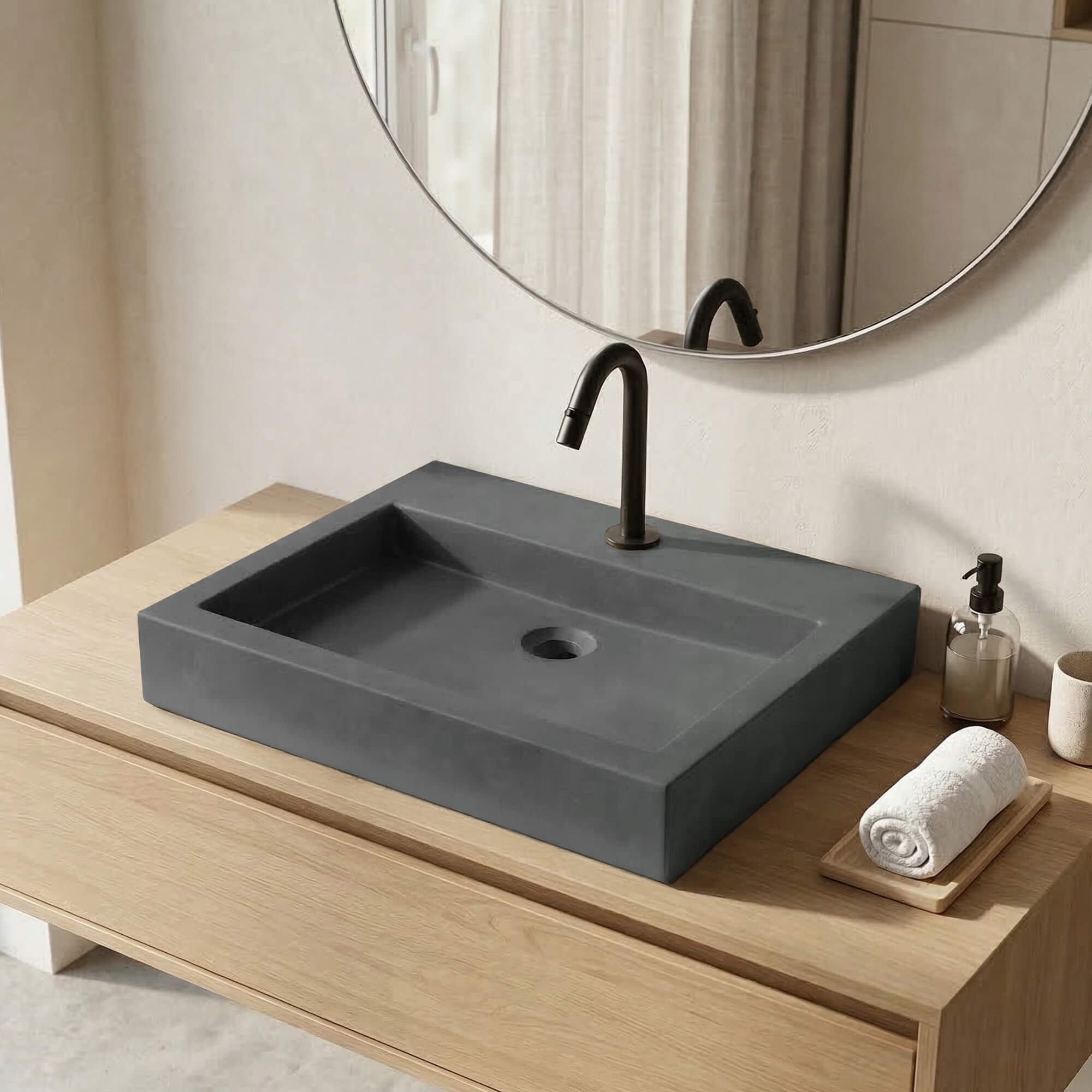 Deze waskom is ontworpen om lang mee te gaan en is gemaakt van massief beton, een robuust materiaal dat de tand des tijds doorstaat zonder uit de mode te raken. Het handgemaakte ontwerp garandeert een uniek stuk, waarbij elke waskom lichte natuurlijke variaties heeft die bijdragen aan zijn charme.