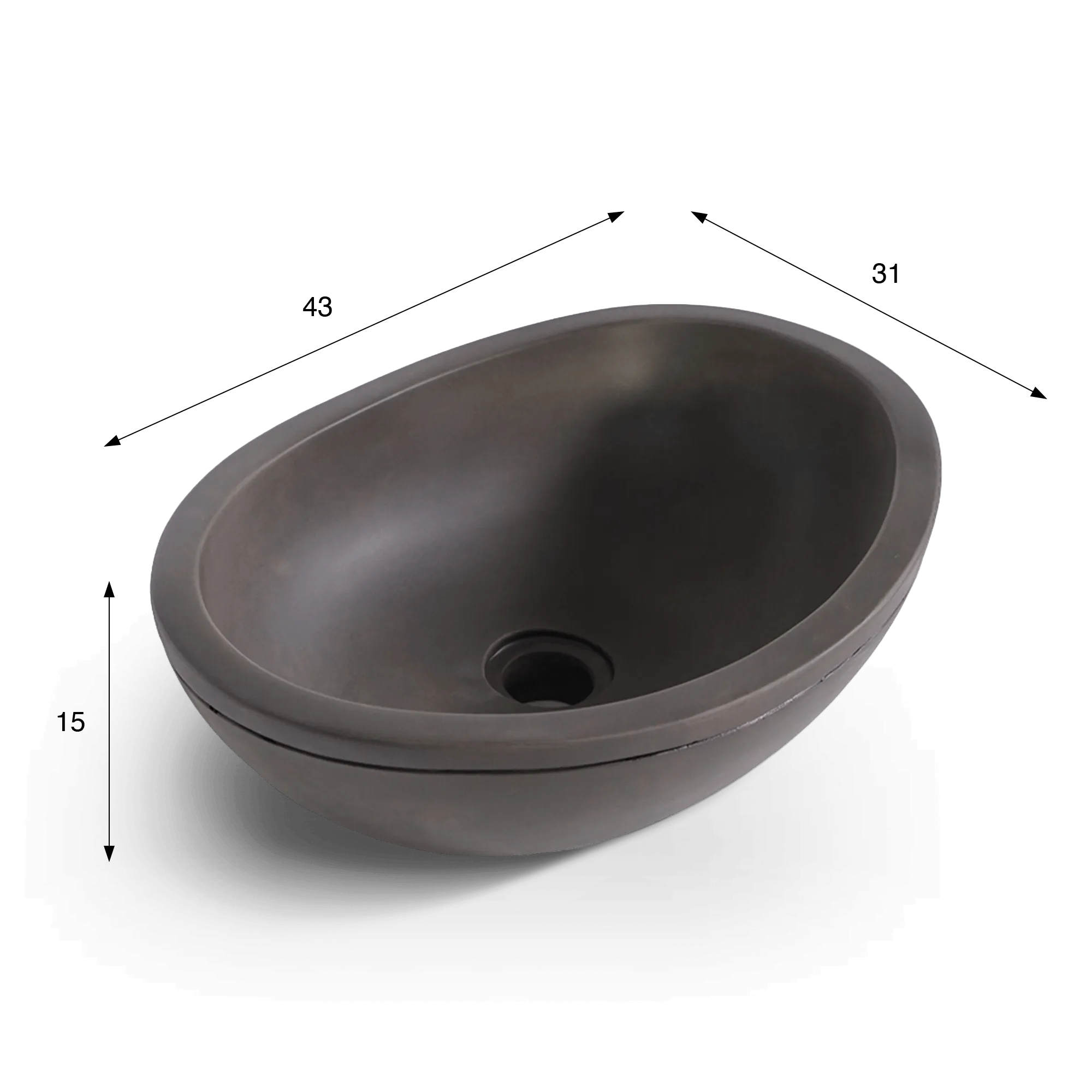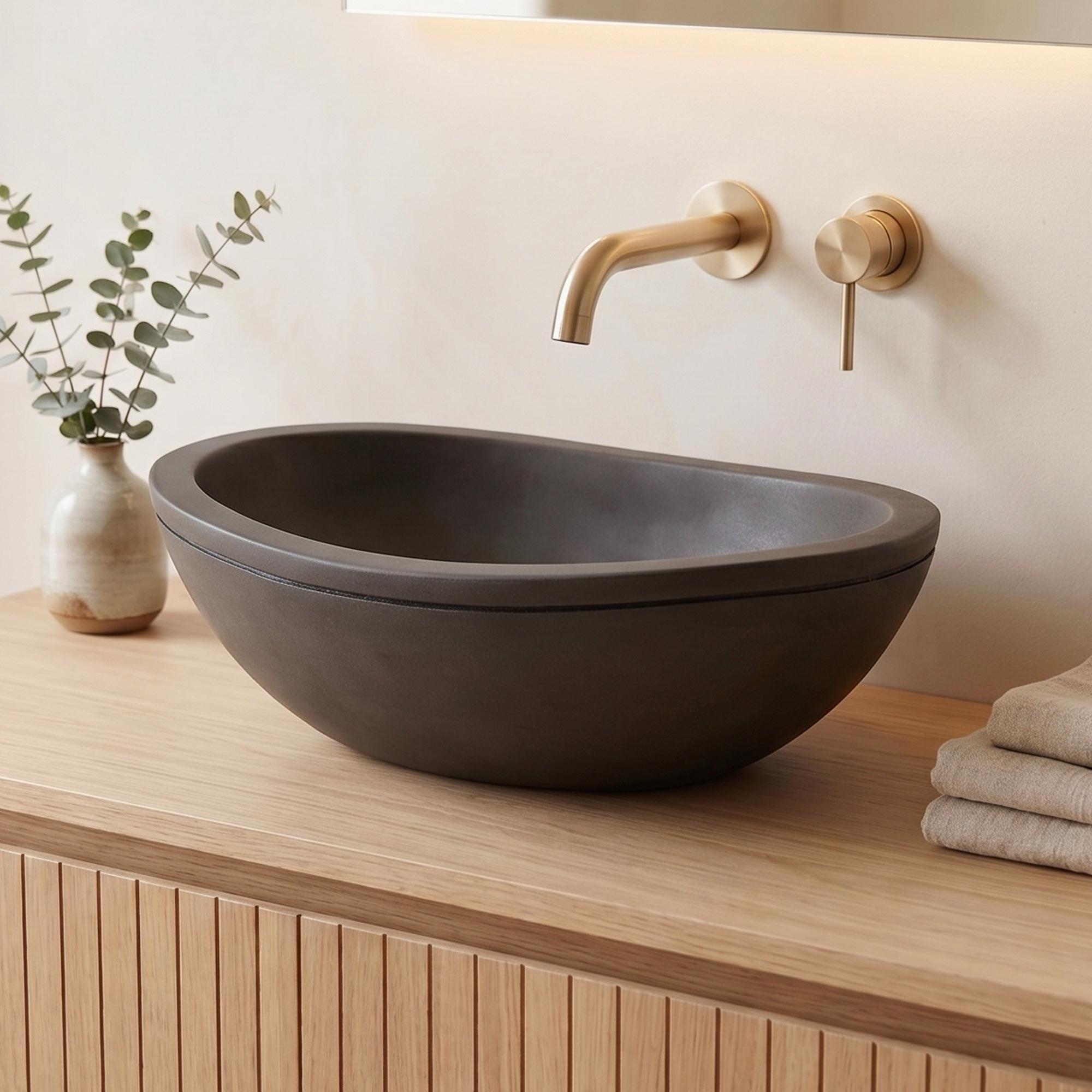 Elk stuk is met de hand gemaakt en heeft subtiele grijstinten en een onberispelijke afwerking die getuigen van de authenticiteit van beton. De licht gebogen vorm en de diepte van 15 cm maken hem comfortabel om elke dag te gebruiken, terwijl spatten tot een minimum beperkt blijven. Met een diameter van 43 x 31 cm is de waskom perfect geschikt voor plaatsing op een badkamermeubel of een wastafelblad van natuurlijk hout, marmer of steen.