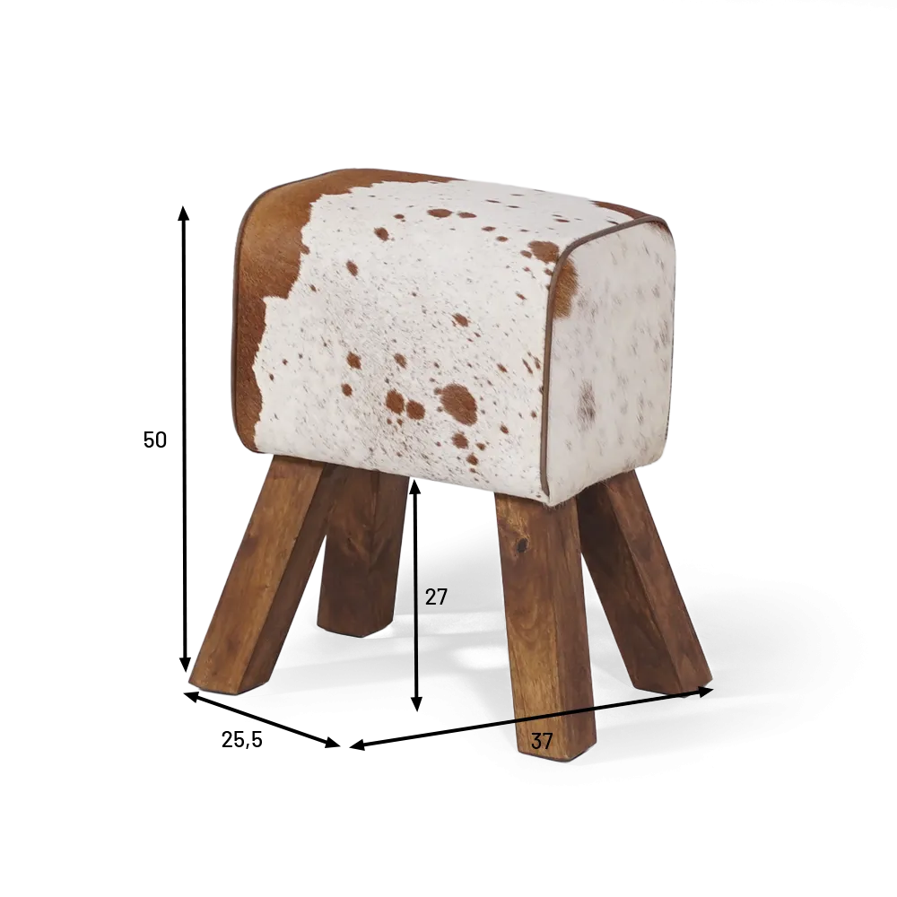 Geïnspireerd door de westernwereld herinterpreteert deze kleine bank van koeienhuid en massief hout op elegante wijze het paard met deommel. De royaal gestoffeerde rechthoekige zitting, bekleed met echte huid met een uniek patroon, geeft elk stuk een uniek en authentiek karakter. Het contrast tussen de zachtheid van het materiaal en de stevigheid van de massief houten poten accentueert de rustieke maar verfijnde uitstraling.