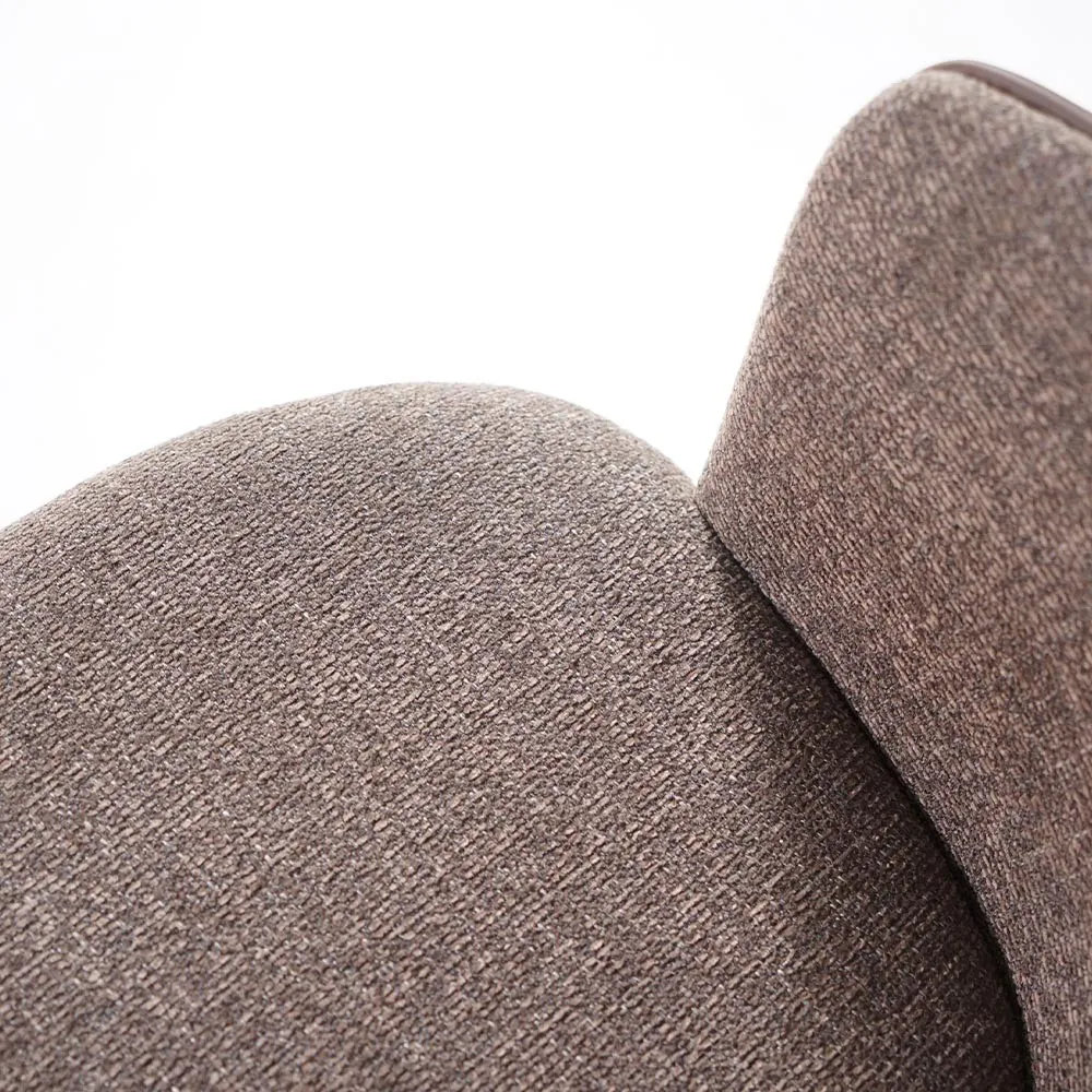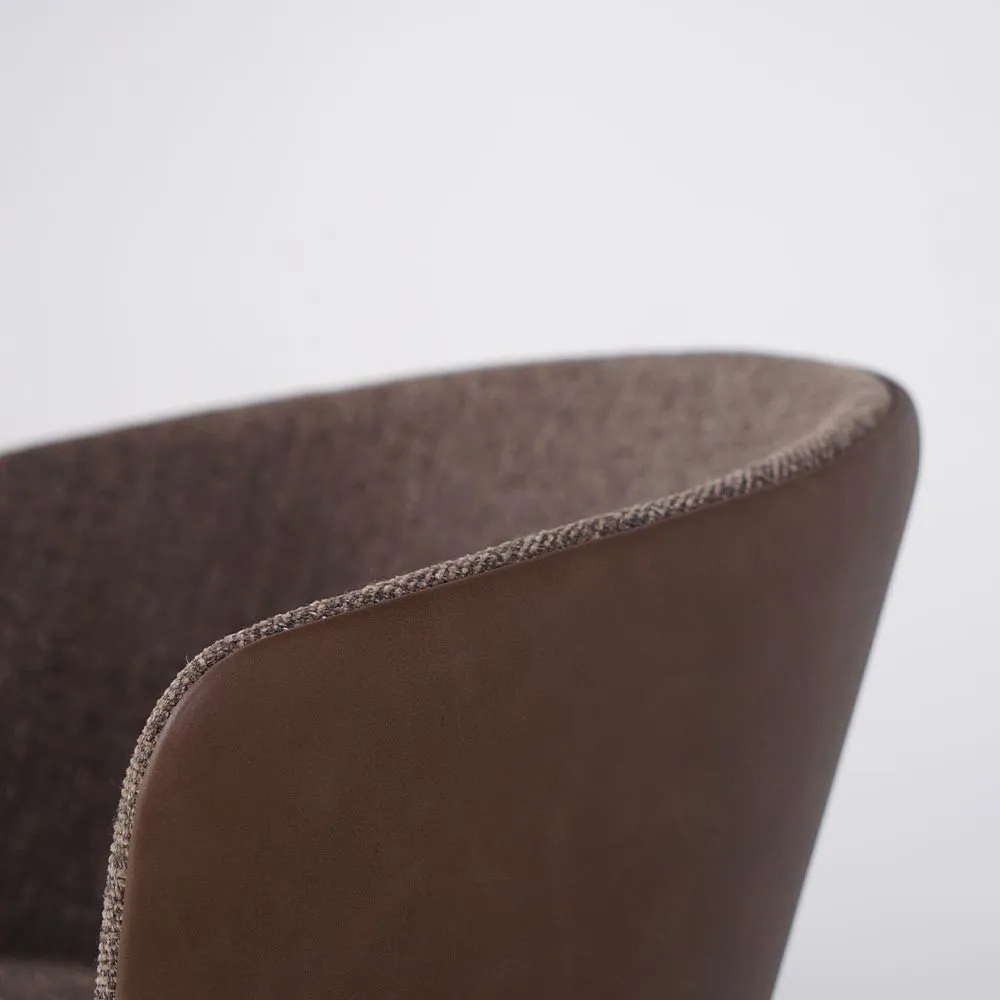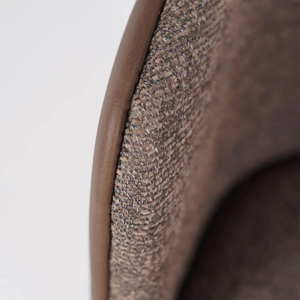 De bruine bouclé stof die de zitting en rugleuning bekleedt, voelt zacht en warm aan en creëert een uitnodigende sensatie. Deze gestructureerde bekleding contrasteert subtiel met het bruine kunstleer dat de achterkant van de rugleuning bedekt, wat een extra vleugje verfijning toevoegt. De keuze voor zorgvuldig geselecteerd synthetisch leer combineert esthetiek met onderhoudsgemak en garandeert een lange levensduur.