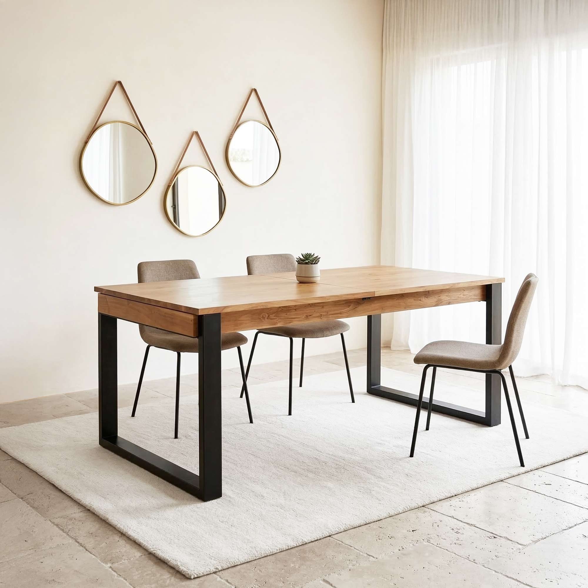 Ontworpen voor interieurs waar functionele striktheid en uitgesproken esthetiek samenkomen, past deze uitschuifbare eettafel perfect binnen de Osaka-collectie, die wij hebben ontwikkeld als een eerbetoon aan de Japanse industriële stijl. Minimalistisch in vorm, maar veeleisend in afwerking, belichaamt ze een subtiel evenwicht tussen de warmte van massief hout en de strakke lijnen van metaal.