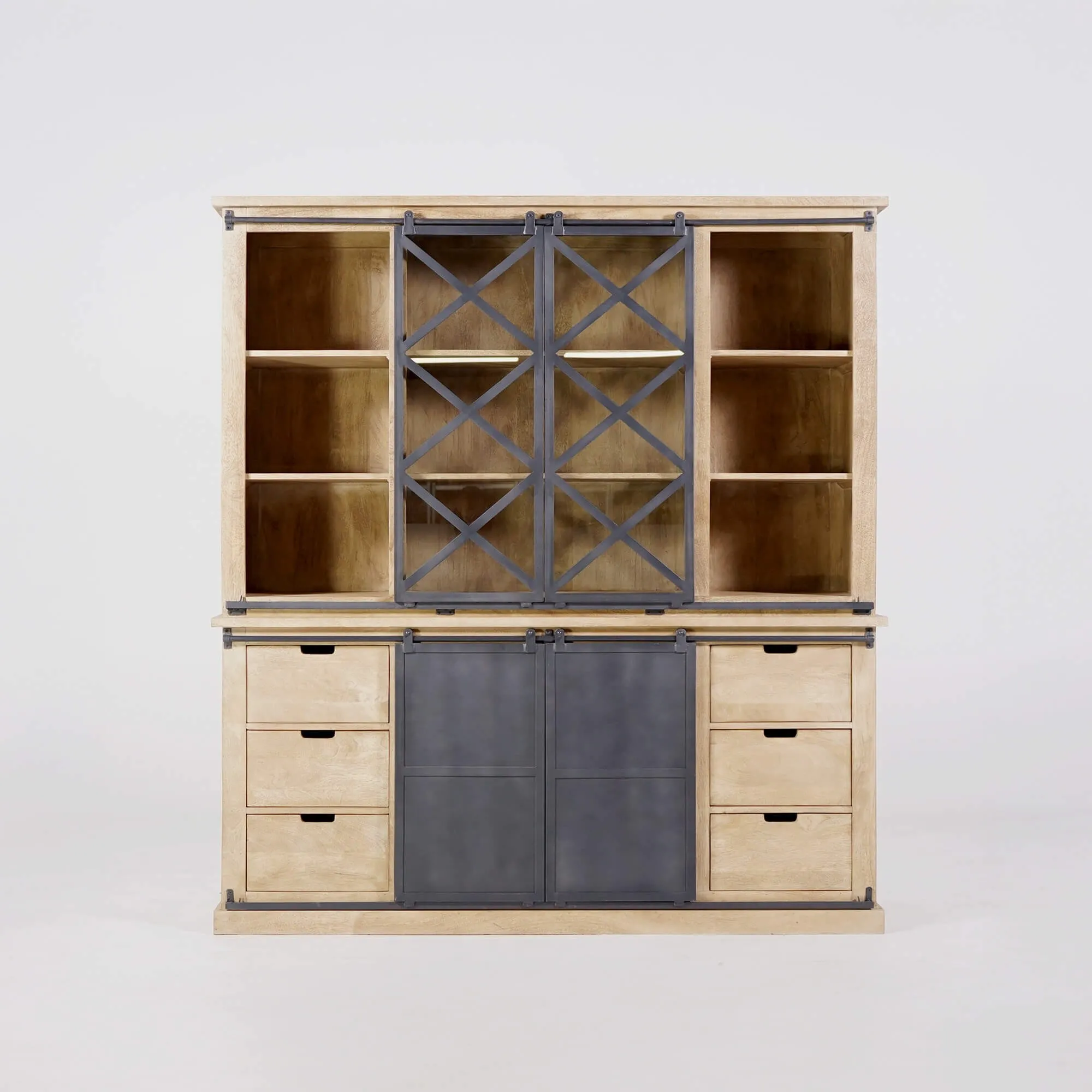 Geïnspireerd door de rauwe, functionele architectuur van Detroit, belichaamt deze vitrinekast in industriële stijl een subtiel evenwicht tussen robuustheid en verfijning. Gemaakt van massief mangohout, gekozen om de natuurlijke nerf en stevigheid, combineert hij de warmte van hout met de strakke uitstraling van antraciet metaal, zichtbaar op de vier schuifdeuren. Dit elegante contrast, dat onze liefde voor authentieke materialen weerspiegelt, vormt de kern van de Detroit-collectie.