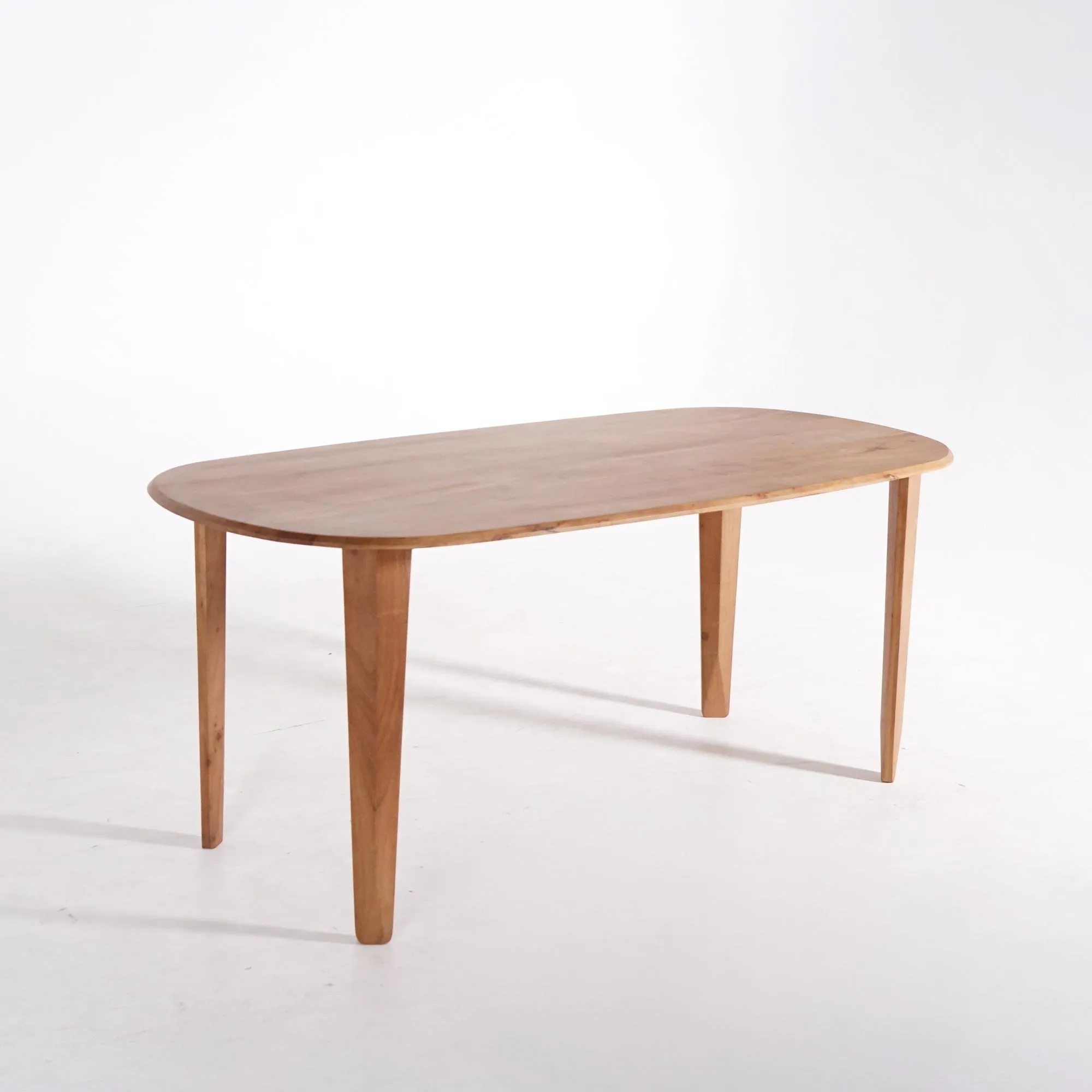 Gemaakt van massief mangohout, overtuigt de ovale Orama eettafel met haar ovale blad van 180 cm op 90 cm, met zacht afgeronde randen en een zijdeachtige textuur. De natuurlijke nerf van het mangohout, zijn warme tinten en subtiele onregelmatigheden geven elk exemplaar een authentiek en levendig karakter. De licht schuine, taps toelopende poten verlengen de lijn van het blad met natuurlijke elegantie en zorgen voor stabiliteit en verfijning.