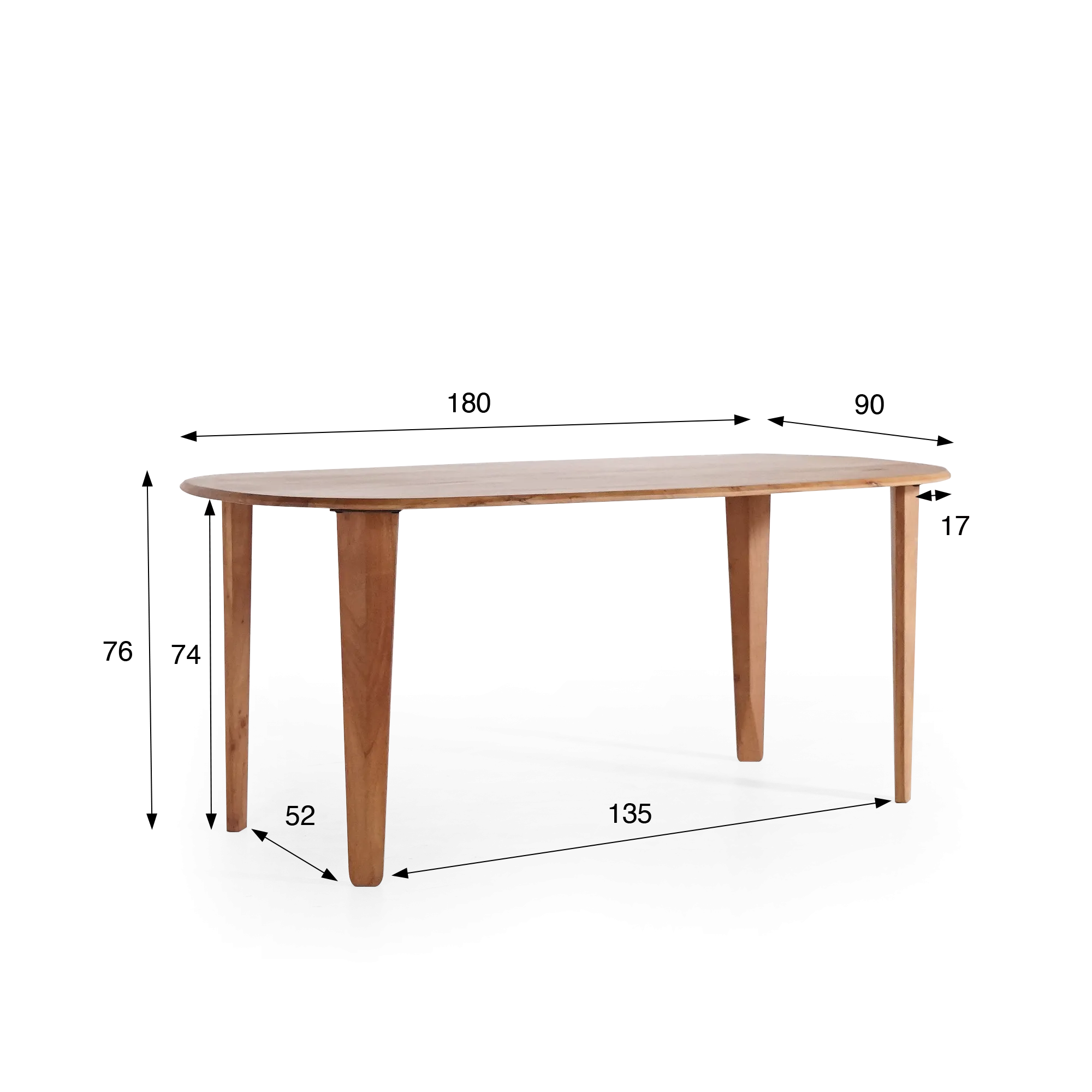 Met een hoogte van 76 cm biedt deze ovale eettafel in massief mangohout een ideale ergonomie voor zowel dagelijkse maaltijden als gezellige momenten. De ovale vorm bevordert de doorstroming en creëert een intieme sfeer waarin iedereen zijn natuurlijke plaats aan tafel vindt.