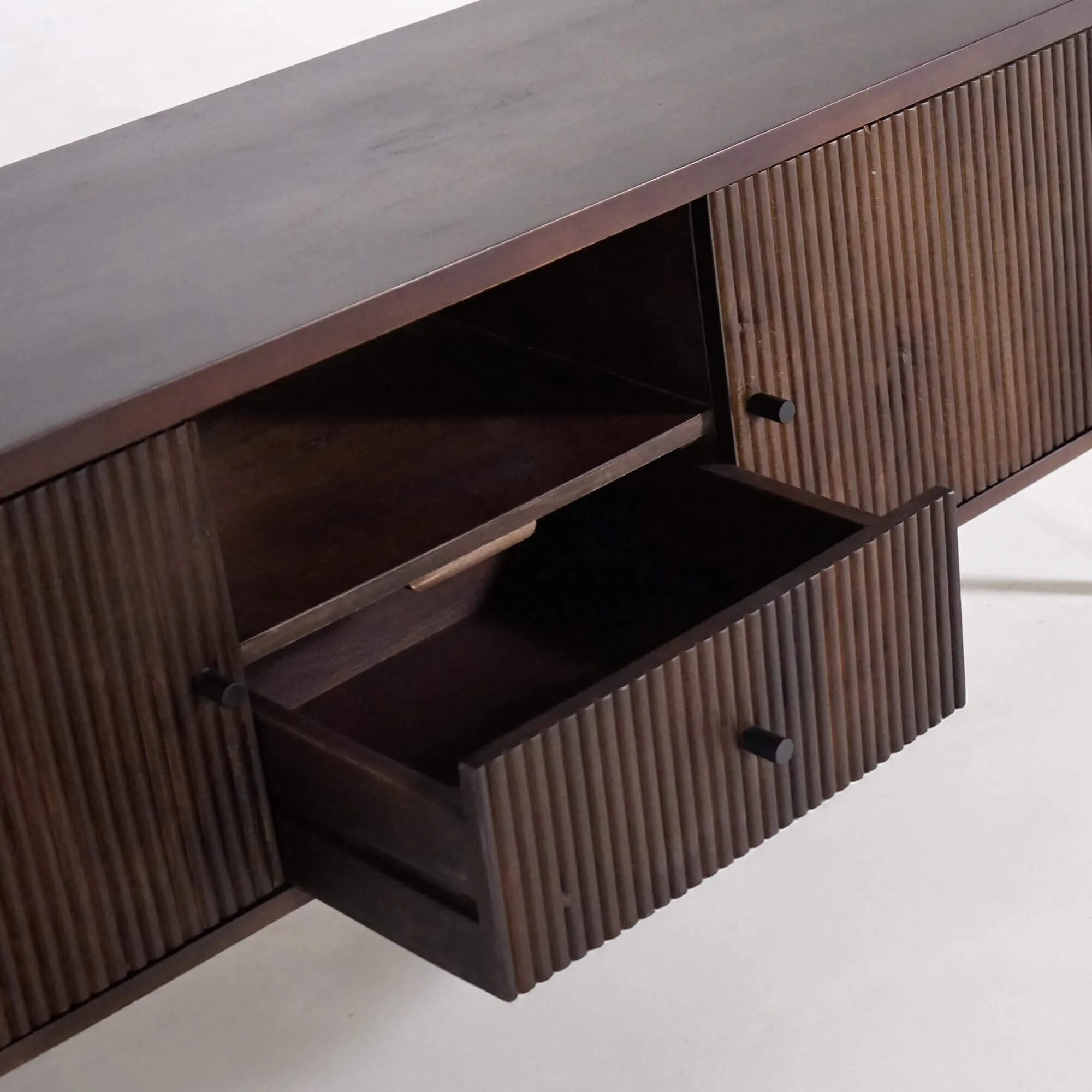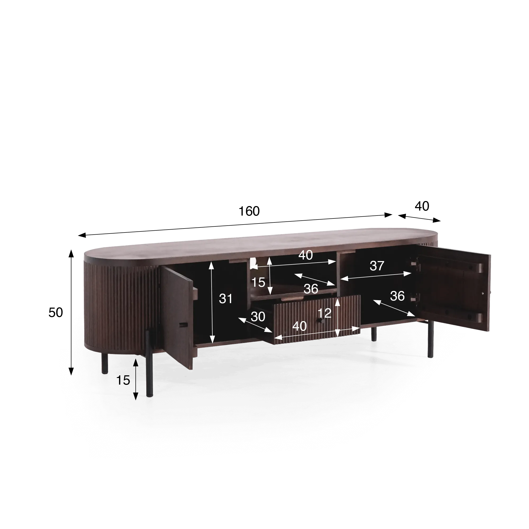 Gemaakt van massief mangohout toont dit tv-meubel een zorgvuldig met de hand afgewerkte oppervlakte die de diepe bruine tinten van het hout prachtig accentueert. De geribbelde voorzijde, kenmerkend voor de Sohana-collectie, vangt het licht op subtiele wijze en creëert een verfijnd spel van schaduw en textuur. De zwarte metalen poten, slank en lichtjes verschoven geplaatst, versterken de visuele lichtheid van het meubel en zorgen tegelijk voor een perfecte stabiliteit.