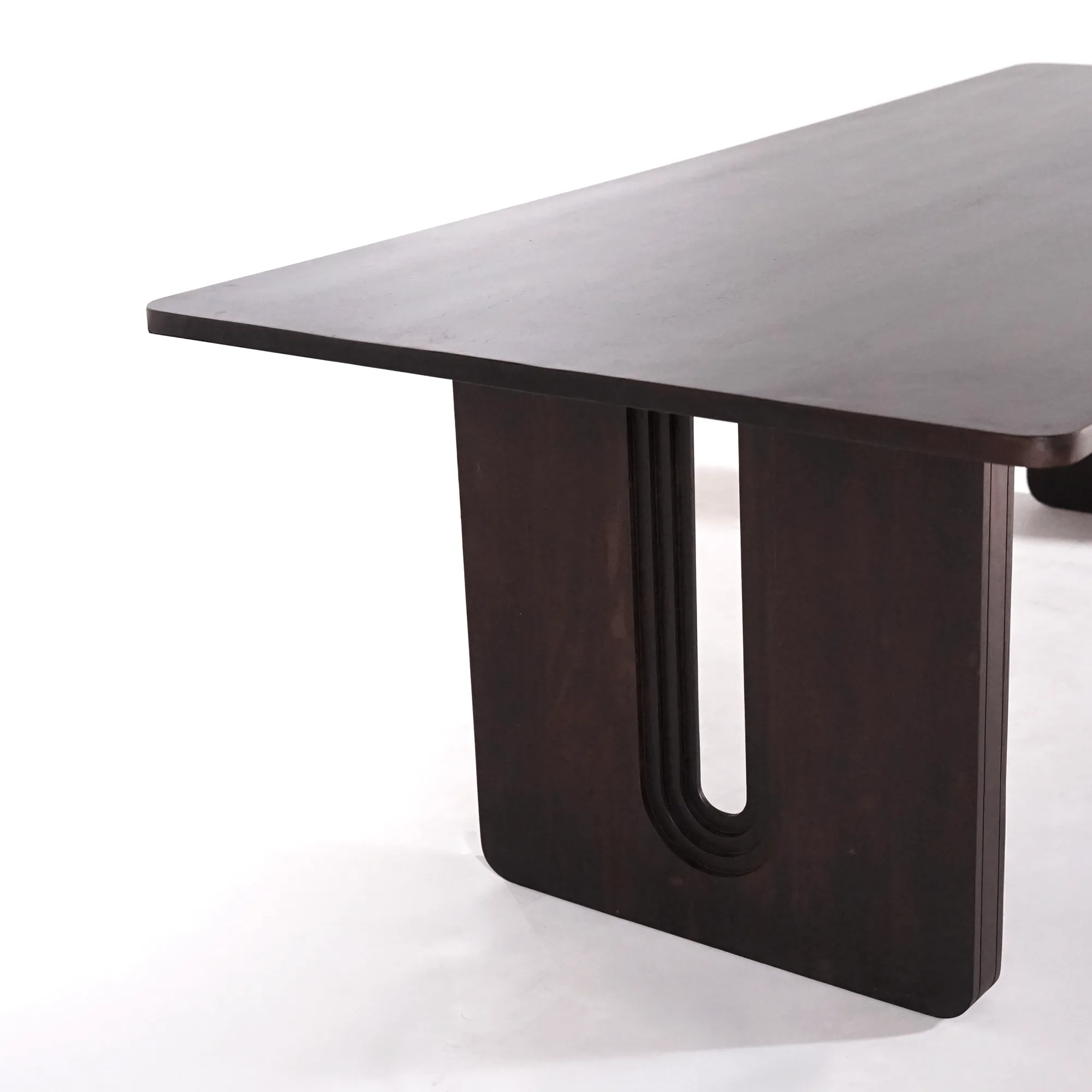 Gemaakt van massief mangohout, overtuigt onze Noba eettafel door de rijke bruine tint en de satijnzachte afwerking. Het tafelblad van 200 × 100 cm, met een dikte van 3 cm, rust op twee volle U-vormige poten met een architecturaal ontwerp. Hun precieze afwerking zorgt voor een grafische uitstraling en een opmerkelijke stabiliteit. Het contrast tussen de visuele lichtheid van het blad en de stevige basis creëert een subtiele harmonie, trouw aan de filosofie achter haar ontwerp.
