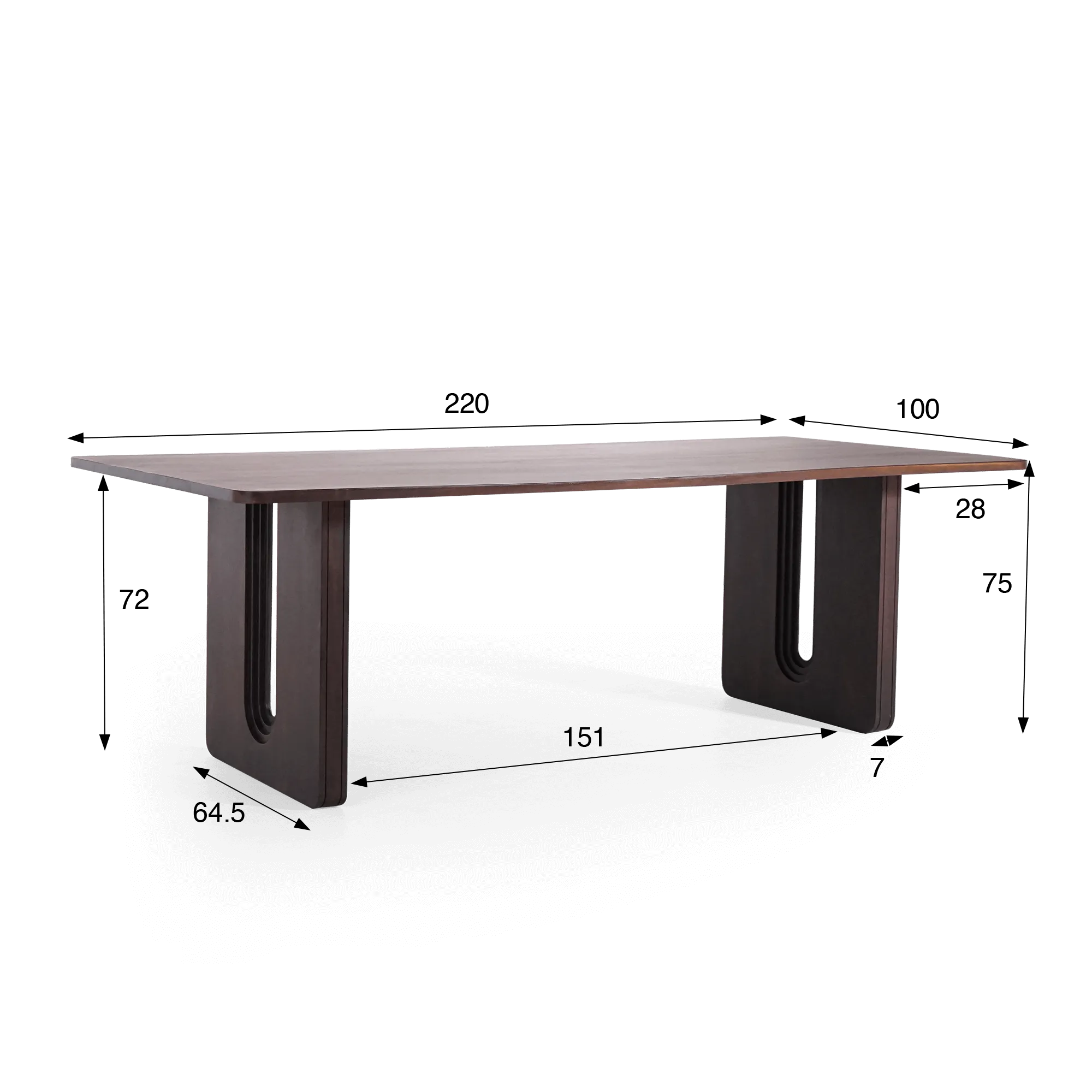 Gemaakt van massief mangohout, overtuigt onze Noba eettafel door de rijke bruine tint en de satijnzachte afwerking. Het tafelblad van 220 × 100 cm, met een dikte van 3 cm, rust op twee volle U-vormige poten met een architecturaal ontwerp. Hun precieze afwerking zorgt voor een grafische uitstraling en een opmerkelijke stabiliteit. Het contrast tussen de visuele lichtheid van het blad en de stevige basis creëert een subtiele harmonie, trouw aan de filosofie achter haar ontwerp.