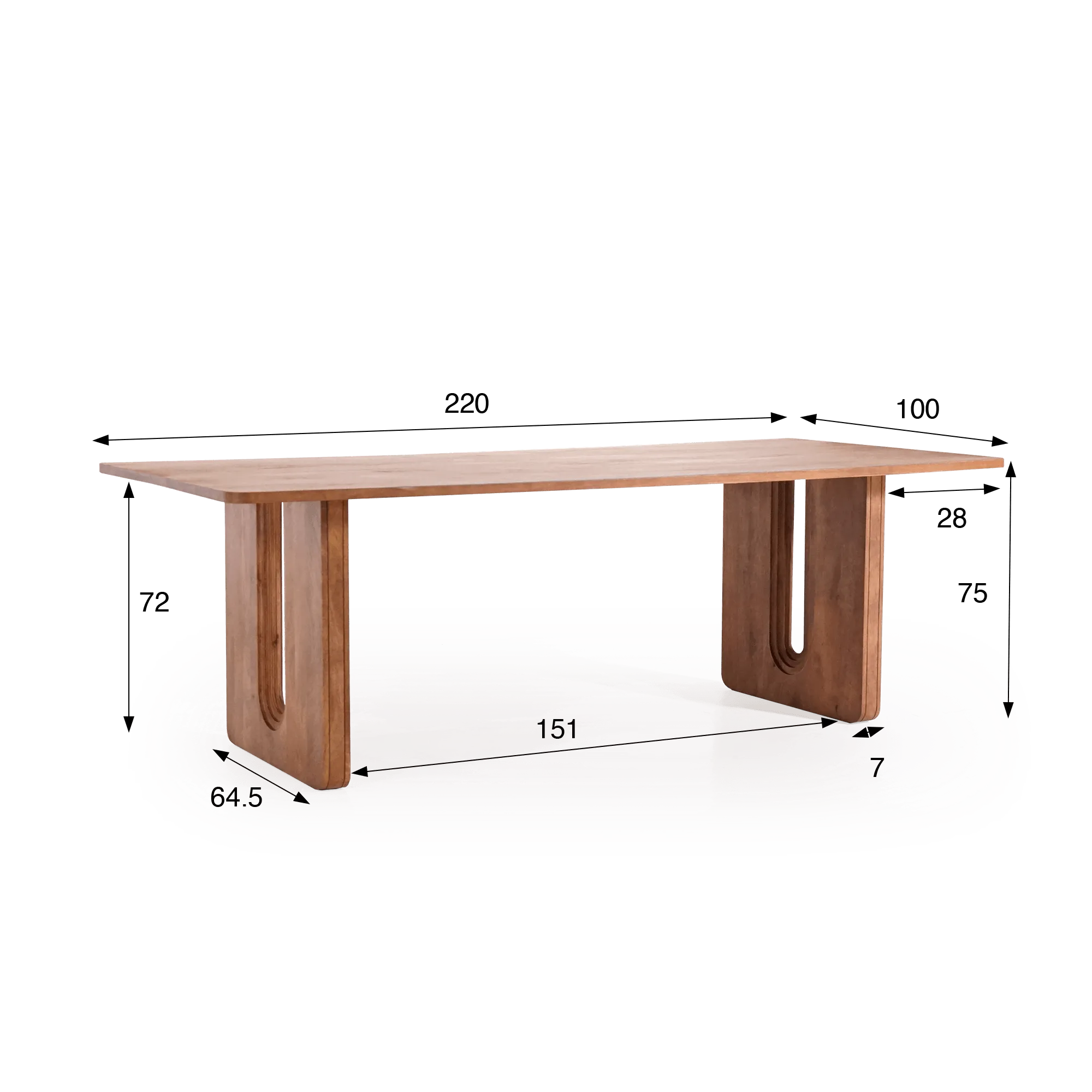 Gemaakt van massief mangohout, onthult de Noba-eettafel de rijke, natuurlijke uitstraling van deze edele houtsoort. De licht amberkleurige, natuurlijke bruine tint speelt subtiel met het licht en creëert een warme, rustgevende sfeer. Het royale tafelblad van 220 × 100 cm rust op twee sculpturale U-vormige poten, vervaardigd uit hetzelfde materiaal. Hun ontwerp, tegelijk geometrisch en vloeiend, geeft de tafel structuur en een uitgesproken sculpturale aanwezigheid.