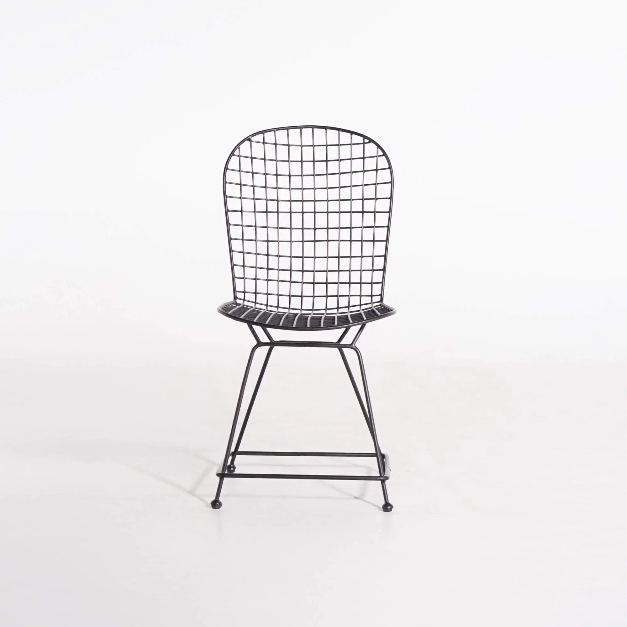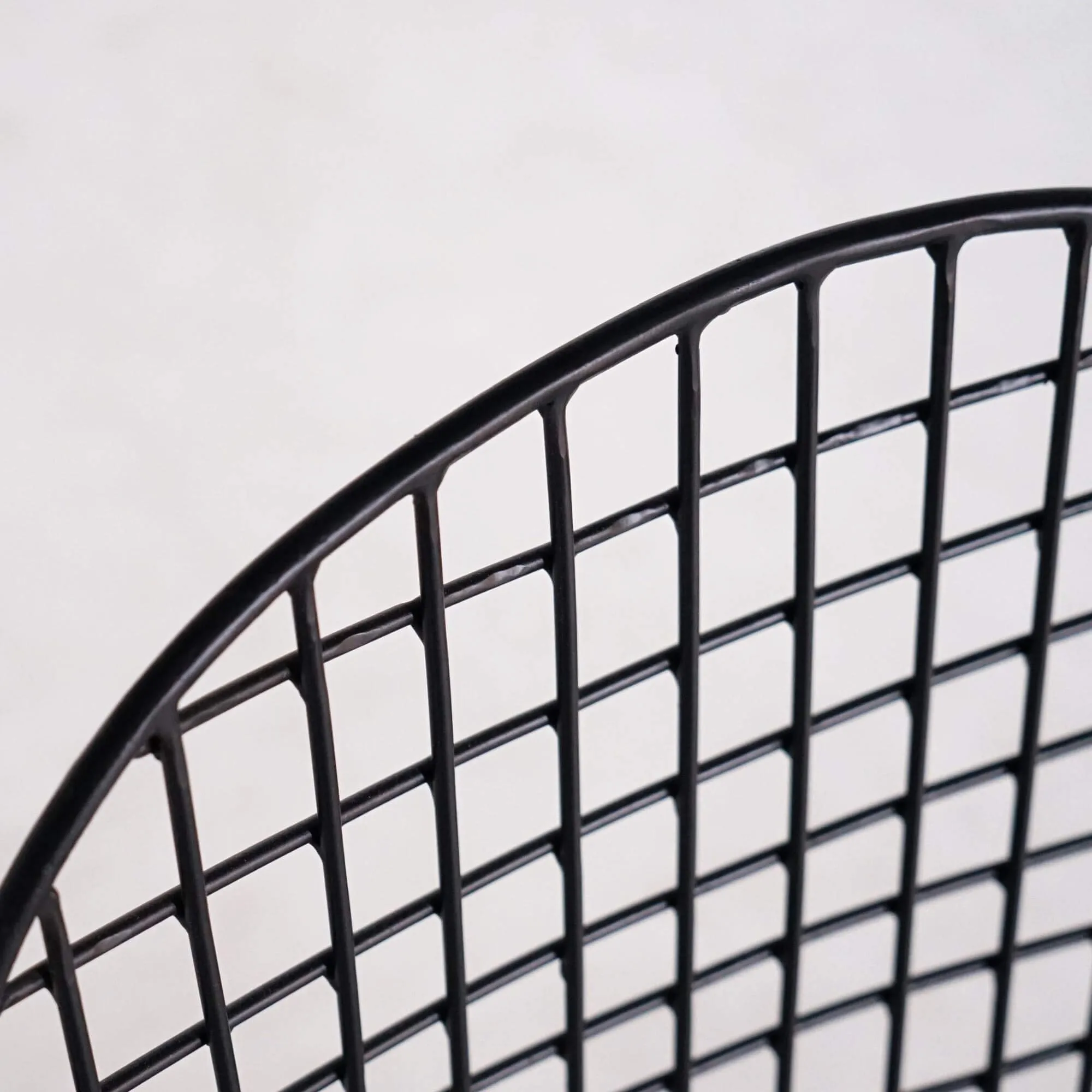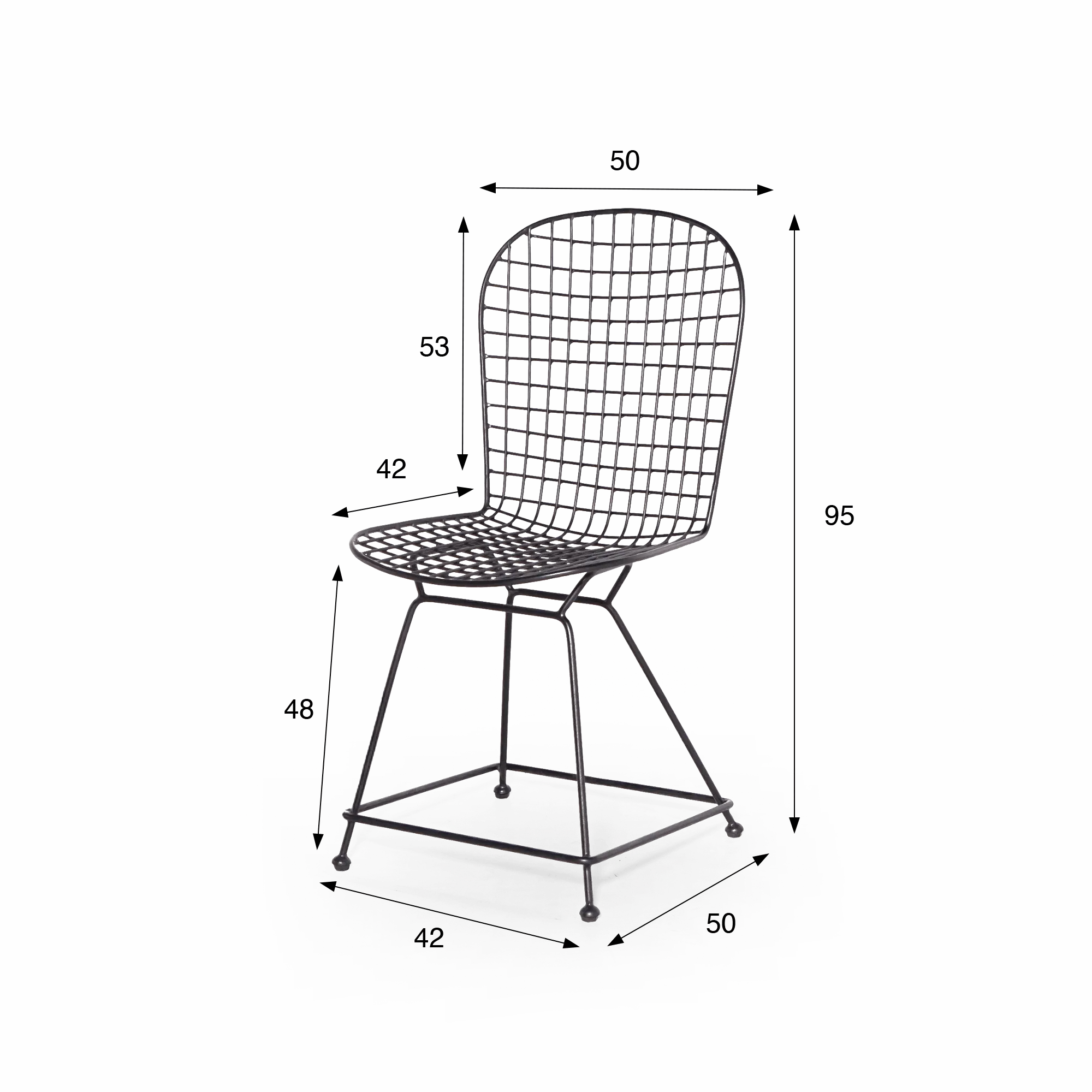 Ambachtelijk vervaardigd uit massief metaal met een zwarte lakafwerking, speelt de metalen stoel in industriële stijl Wire met transparantie en de geometrie van zijn roosterstructuur. De hoge rugleuning van 53 cm volgt subtiel de vorm van de rug, terwijl de zitting van 42 cm diep en 50 cm breed een stabiel en uitgebalanceerd comfort biedt. De fijne, regelmatige lijnen van het frame creëren een luchtige indruk, versterkt door de taps toelopende poten die verbonden zijn met een dwarsbalk voor perfecte stabiliteit.