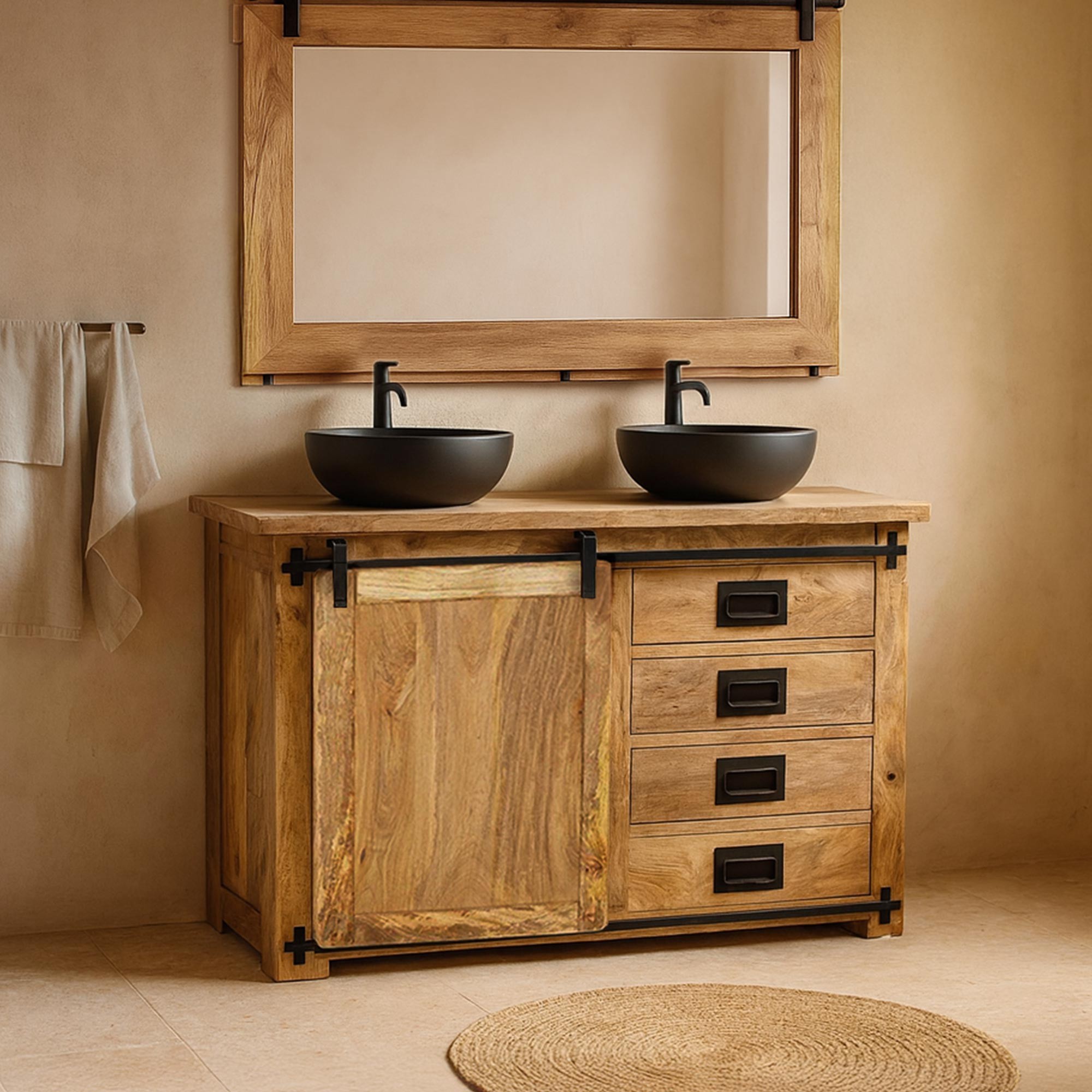 Bedacht als een pronkstuk voor de badkamer, belichaamt dit houten en metalen badkamermeubel onze wens om rustieke charme te combineren met hedendaagse functionaliteit. Geïnspireerd op landelijk meubilair, herwerkt in een industriële stijl, valt het op door de warmte van het massieve hout van mangohout en de stevige afwerking in zwart metaal, ontworpen om lang mee te gaan.