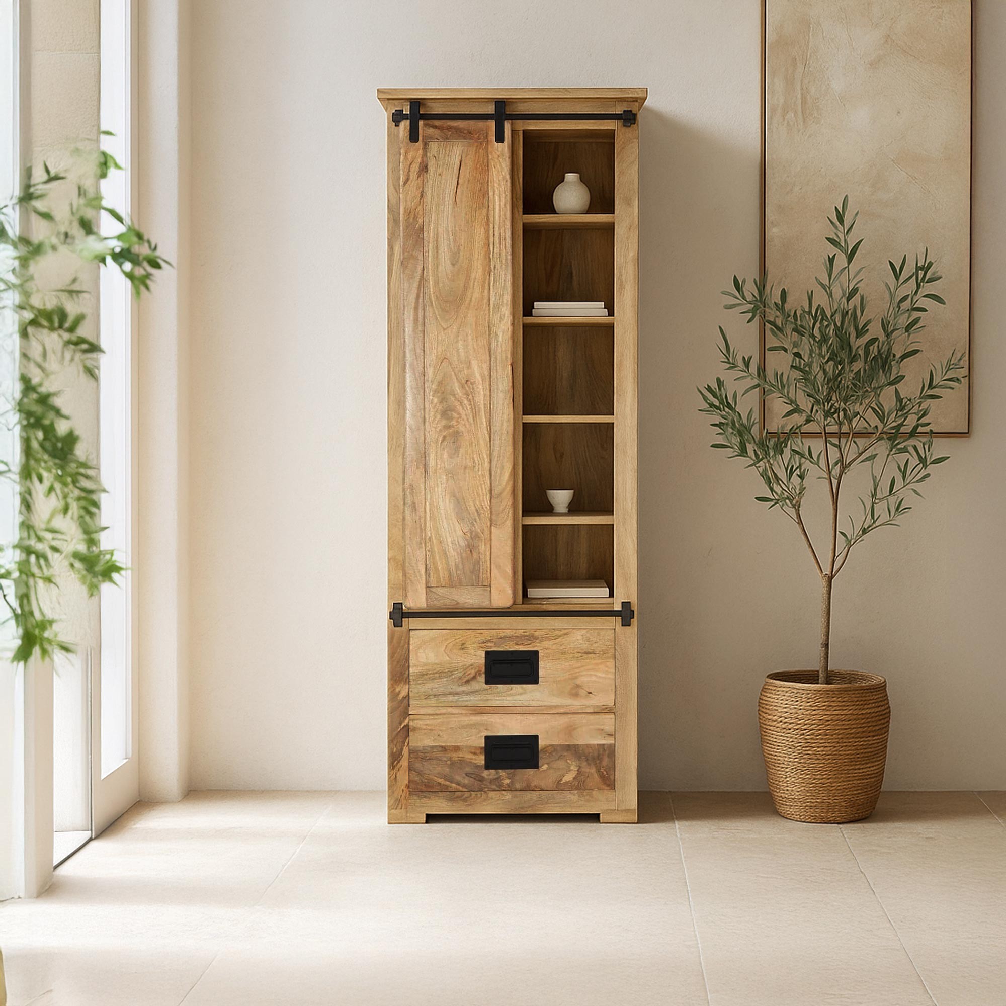 Met de hand vervaardigd uit massief mangohout benadrukt deze industriële boekenkast de natuurlijke schoonheid van de houtnerf en de warmte van haar goudbruine tint. Elke plank wordt zorgvuldig geselecteerd voor een homogeen geheel, waarbij het subtiele reliëf textuur en diepte toevoegt. We hebben gekozen voor een schuifdeur op een zwart metalen rail, als knipoog naar traditionele schuurdeuren, die de toegang tot de compartimenten vergemakkelijkt en de stijl versterkt.