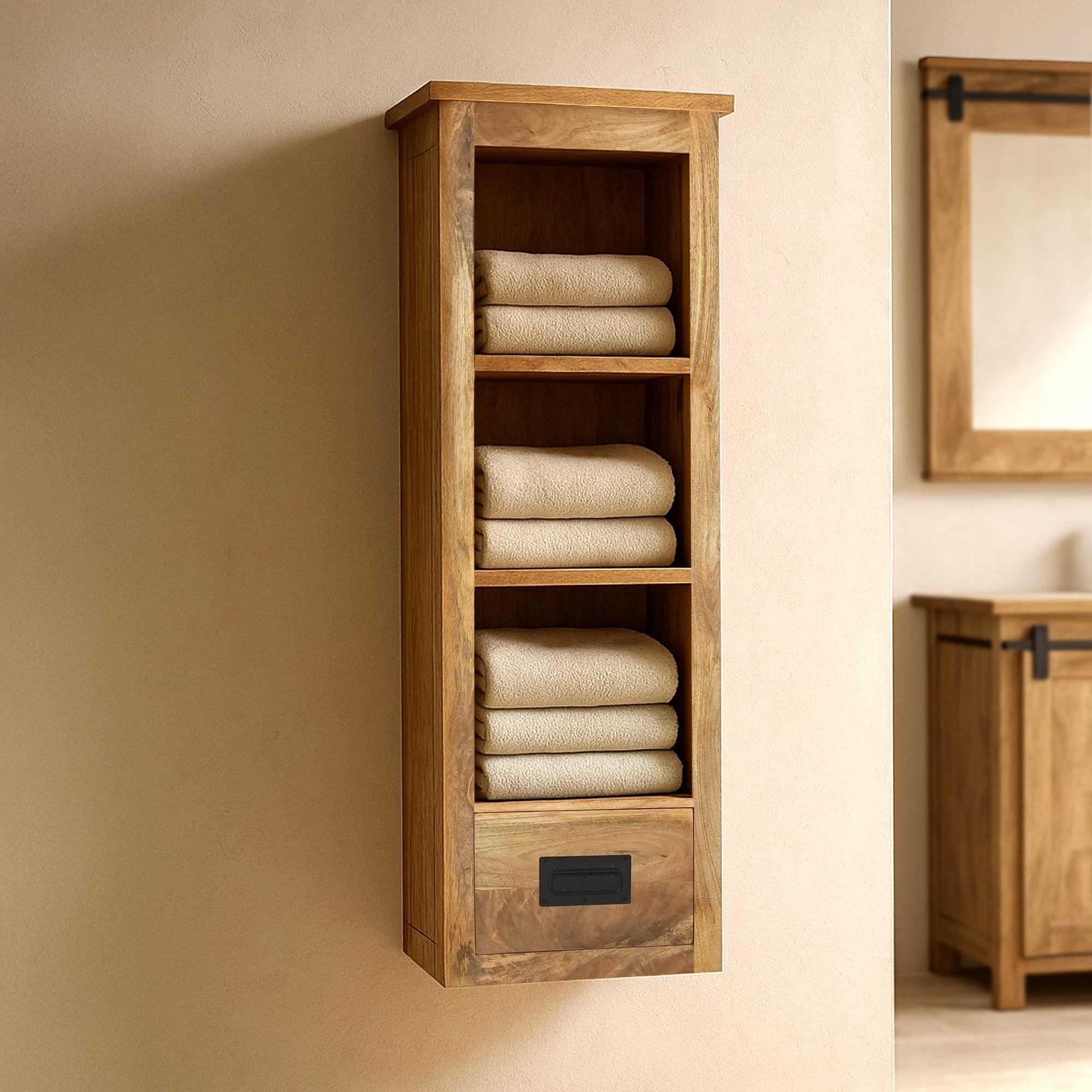 Deze badkamerkolom in massief hout weerspiegelt onze wens om meubels te creëren die zowel functioneel als betekenisvol zijn — een stuk dat men kiest voor zijn praktische nut én voor de tijdloze charme die het aan de ruimte toevoegt.